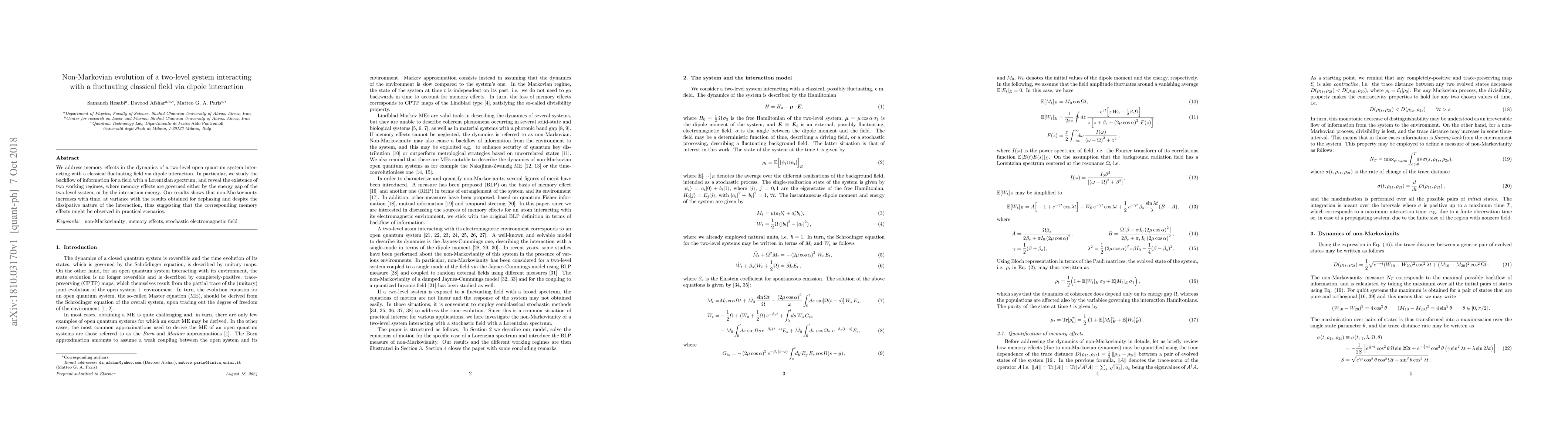 This paper investigates memory effects in a two-level quantum system interacting with a fluctuating classical field through dipole interaction, revealing two regimes of non-Markovianity governed by either the system's energy gap or the interaction energy. Contrary to dephasing, non-Markovianity increases with time, suggesting observable memory effects in practical scenarios.