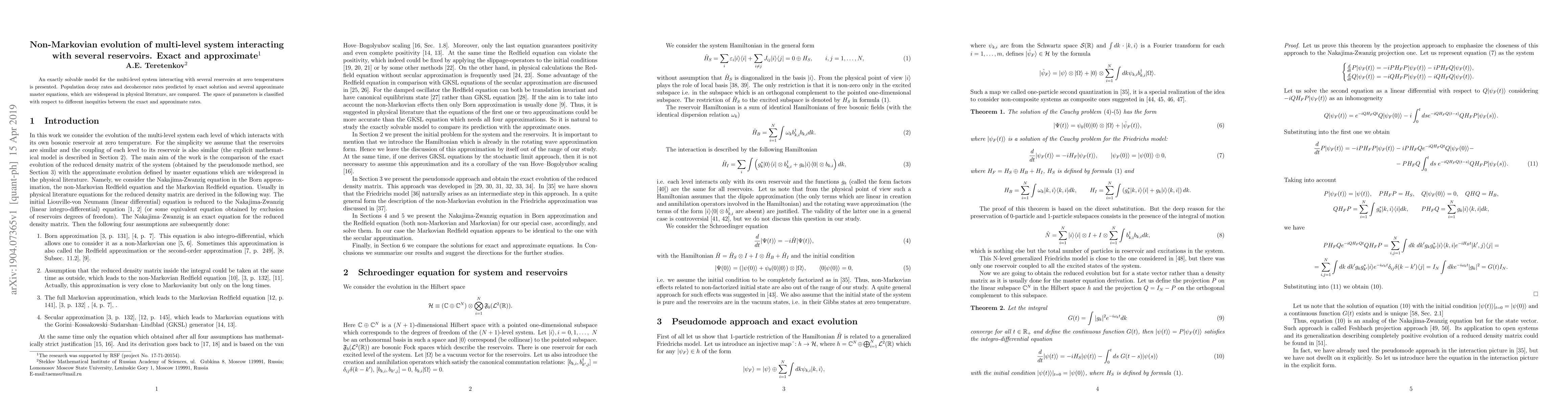 This paper presents an exactly solvable model for a multi-level system interacting with multiple reservoirs at zero temperature, comparing exact decay and decoherence rates to those from common approximate master equations. It classifies parameter spaces based on discrepancies between exact and approximate solutions.