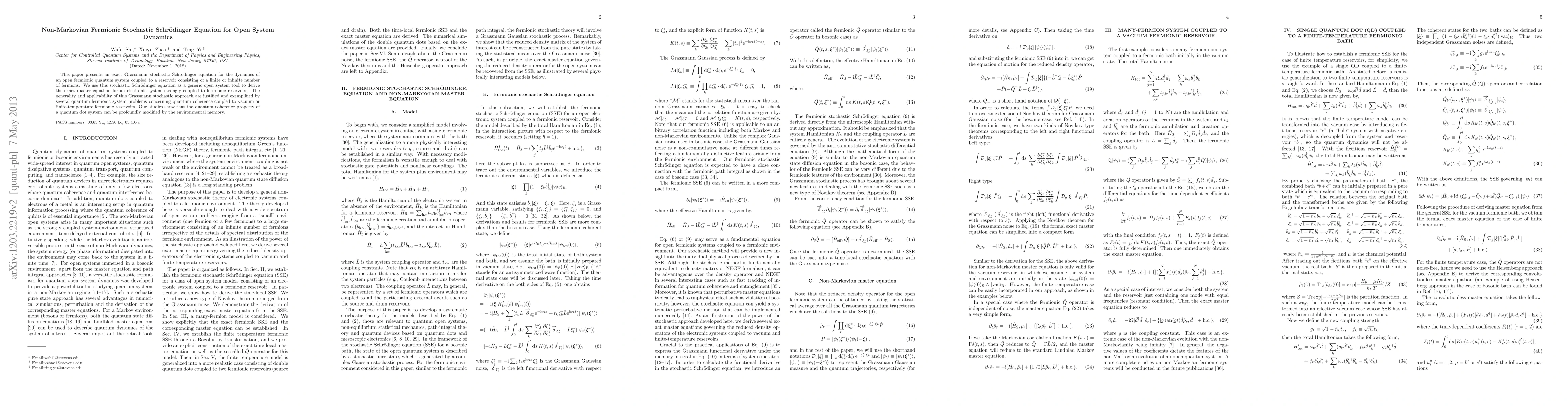 This paper introduces a Grassmann stochastic Schrödinger equation for open fermionic quantum systems, deriving an exact master equation for systems strongly coupled to electronic reservoirs. It demonstrates the method's applicability to quantum decoherence and transport in both vacuum and finite-temperature environments, showing how environmental memory can significantly alter quantum coherence.