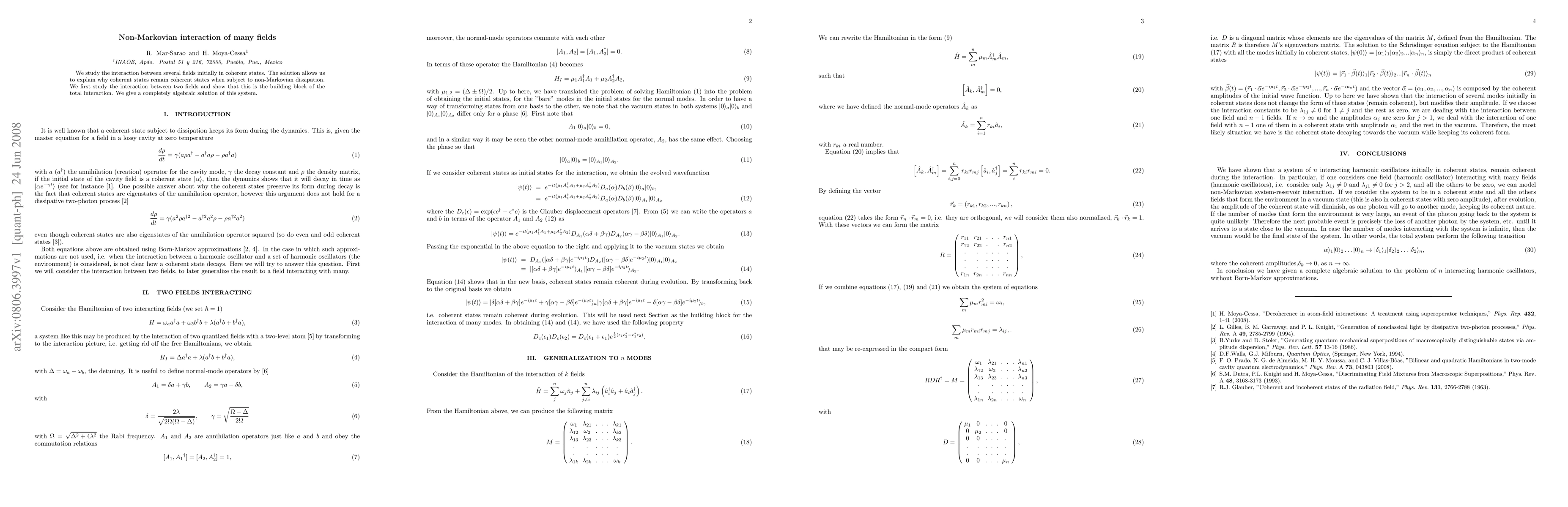 Researchers study how multiple fields interact with each other in a non-Markovian way, finding a solution that explains why coherent states remain coherent under certain conditions.