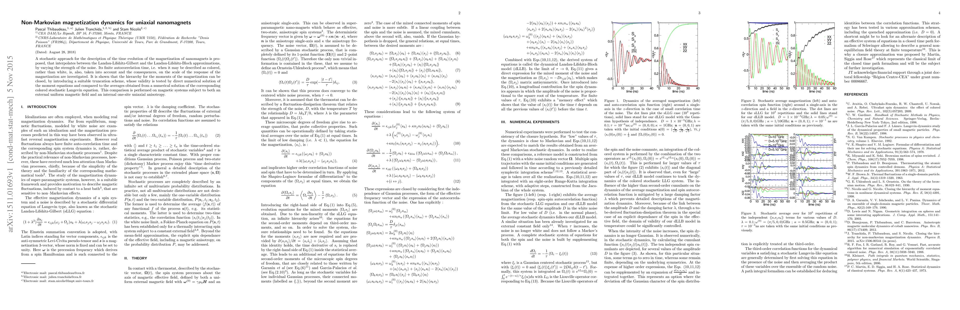 A stochastic approach for the description of the time evolution of the magnetization of nanomagnets is proposed, that interpolates between the Landau-Lifshitz-Gilbert and the Landau-Lifshitz-Bloch approximations, by varying the strength of the noise. Its finite autocorrelation time, i.e. when it may be described as colored, rather than white, is, also, taken into account and the consequences, on the scale of the response of the magnetization are investigated. It is shown that the hierarchy for the moments of the magnetization can be closed, by introducing a suitable truncation scheme, whose validity is tested by direct numerical solution of the moment equations and compared to the averages obtained from a numerical solution of the corresponding colored stochastic Langevin equation. This comparison is performed on magnetic systems subject to both an external uniform magnetic field and an internal one-site uniaxial anisotropy.