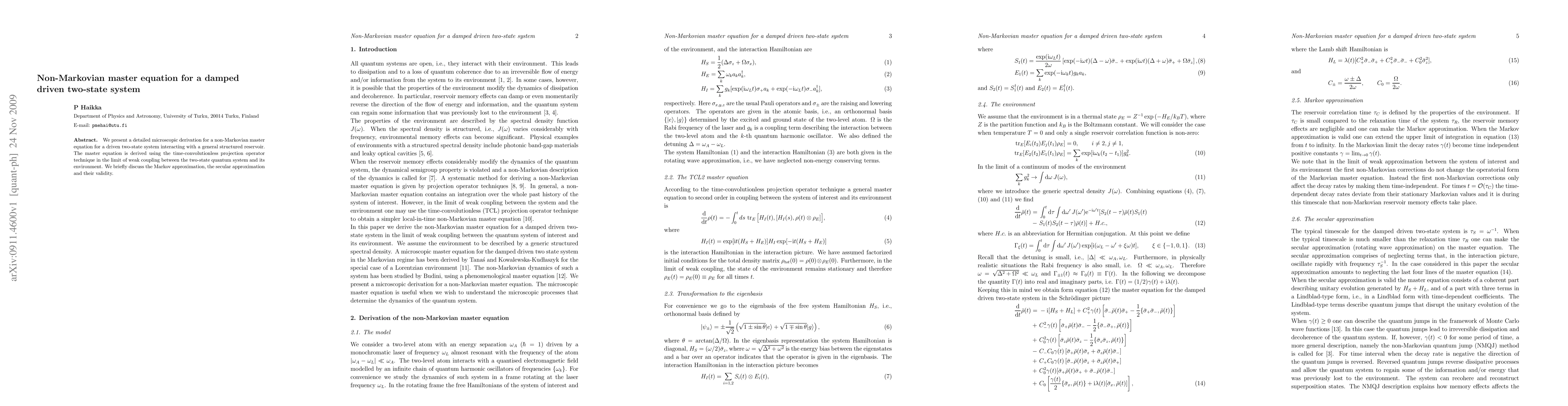 This paper derives a non-Markovian master equation for a weakly coupled driven two-state quantum system using the time-convolutionless projection operator technique. It also examines the Markov and secular approximations, assessing their applicability.