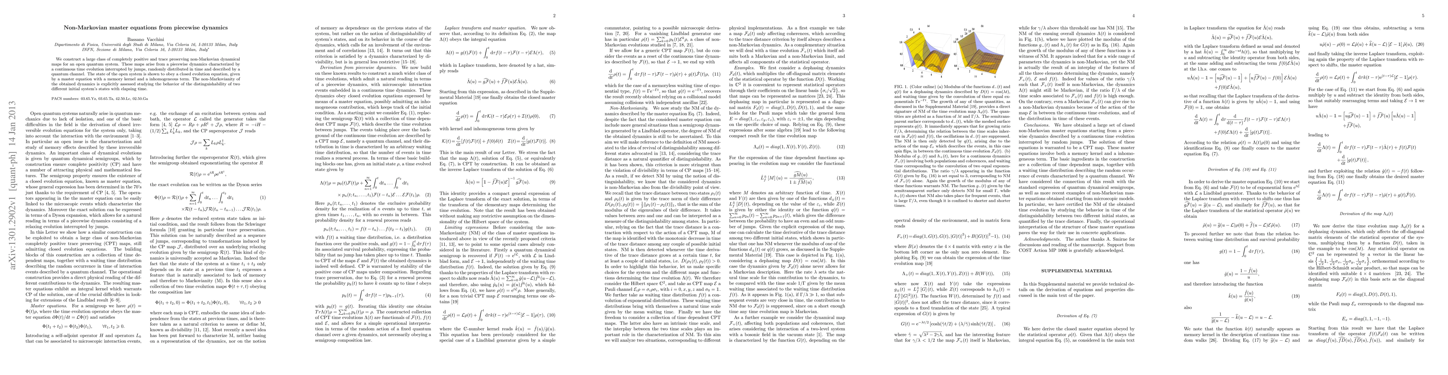 This paper develops non-Markovian master equations for open quantum systems based on piecewise dynamics with random jumps, showing that the system's state evolves according to a master equation with a memory kernel and an inhomogeneous term, and assesses non-Markovianity through the distinguishability of initial states over time.