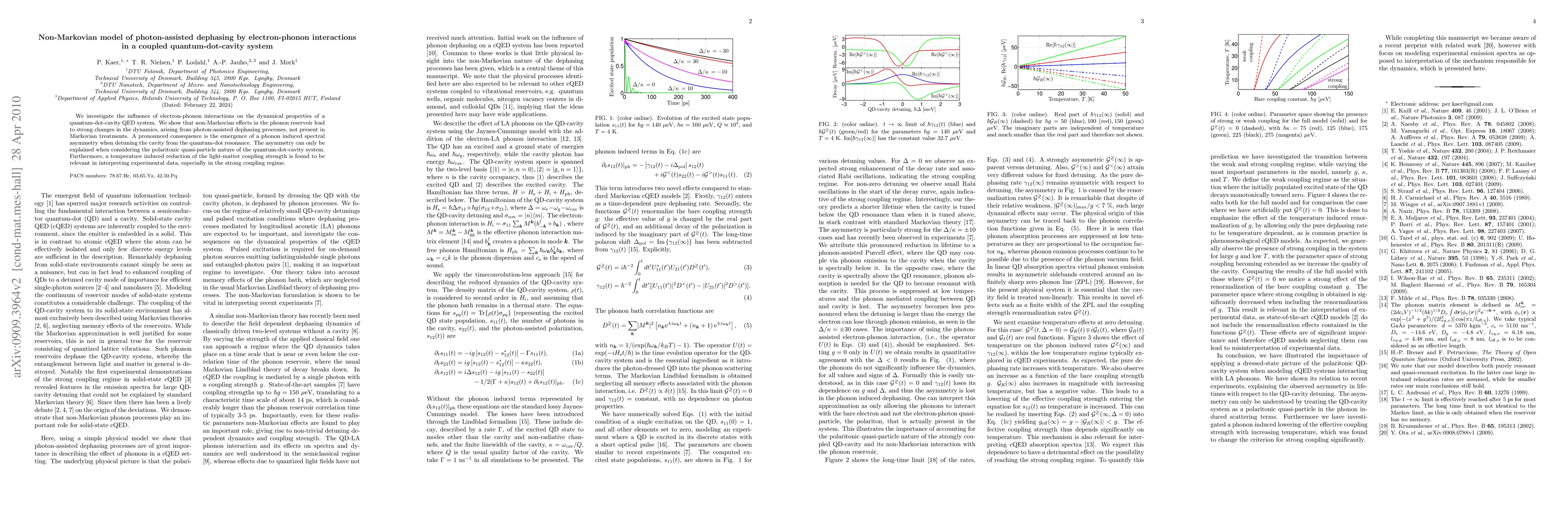 This paper examines electron-phonon interactions in a quantum-dot-cavity system, revealing that non-Markovian effects lead to significant changes in dynamics through photon-assisted dephasing. The study highlights phonon-induced spectral asymmetry and identifies temperature-dependent reductions in light-matter coupling, crucial for interpreting experimental observations in strong coupling regimes.