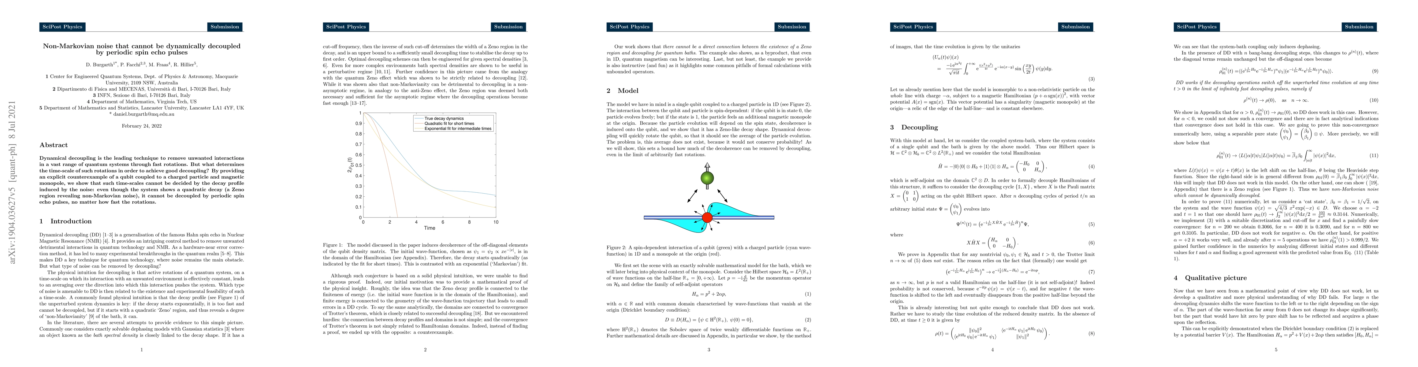 This paper demonstrates that non-Markovian noise in a qubit system coupled to a charged particle and magnetic monopole cannot be effectively mitigated by periodic spin echo pulses, despite showing a quadratic decay profile. It highlights that the time-scale of decoupling rotations is not solely determined by the noise decay profile.