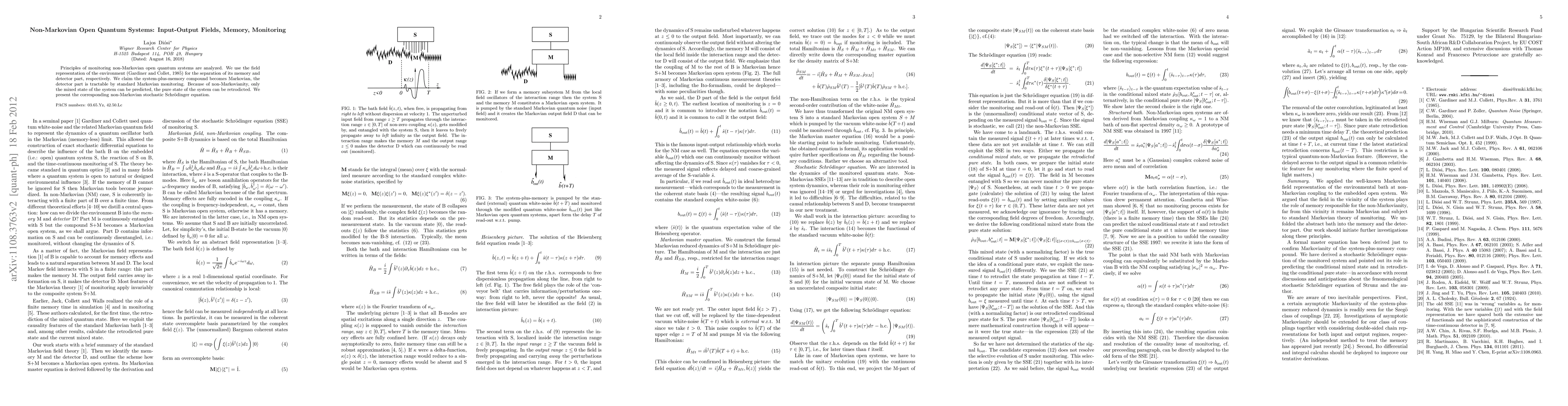 Principles of monitoring non-Markovian open quantum systems are analyzed. We use the field representation of the environment (Gardiner and Collet, 1985) for the separation of its memory and detector part, respectively. We claim the system-plus-memory compound becomes Markovian, the detector part is tractable by standard Markovian monitoring. Because of non-Markovianity, only the mixed state of the system can be predicted, the pure state of the system can be retrodicted. We present the corresponding non-Markovian stochastic Schr\"odinger equation.