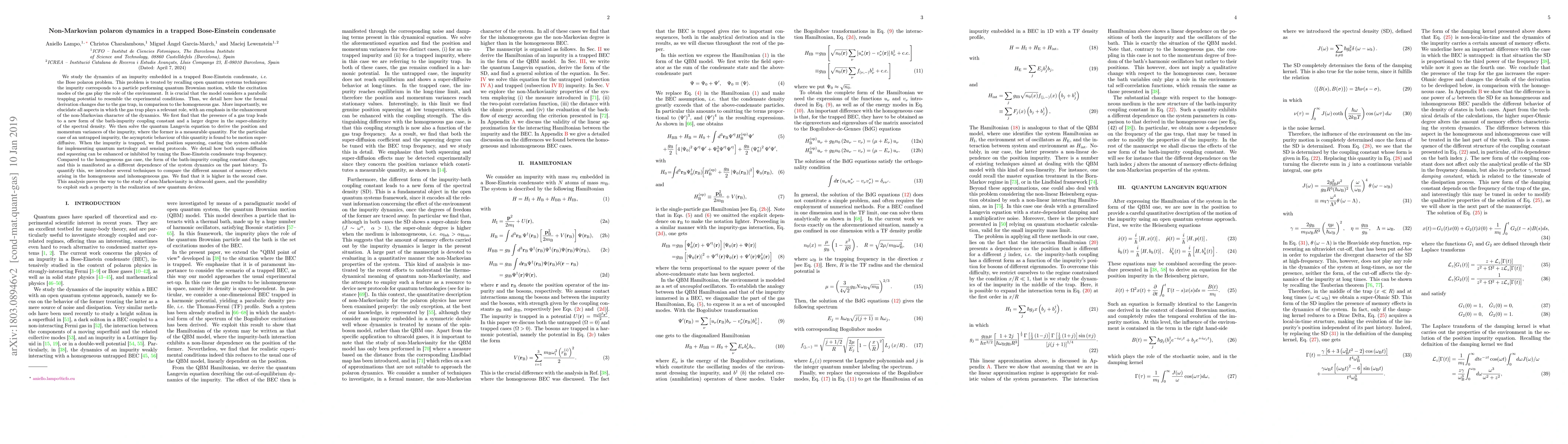 We study the dynamics of an impurity embedded in a trapped Bose-Einstein condensate (Bose polaron), by recalling the quantum Brownian motion model. It is crucial that the model considers a parabolic trapping potential to resemble the experimental conditions. Thus, we detail here how the formal derivation changes due to the gas trap, in comparison to the homogeneous gas. We first find that the presence of a gas trap leads to a new form of the bath-impurity coupling constant and a larger degree in the super-ohmicity of the spectral density. This is manifested as a different dependence of the system dynamics on the past history. To quantify this, we introduce several techniques to compare the different amount of memory effects arising in the homogeneous and inhomogeneous gas. We find that it is higher in the second case. Moreover, we calculate the position variance of the impurity, represenitng a measurable quantity. We show that the impurity experiences super-diffusion and genuine position squeezing. Wdetail how both effects can be enhanced or inhibited by tuning the Bose-Einstein condensate trap frequency.