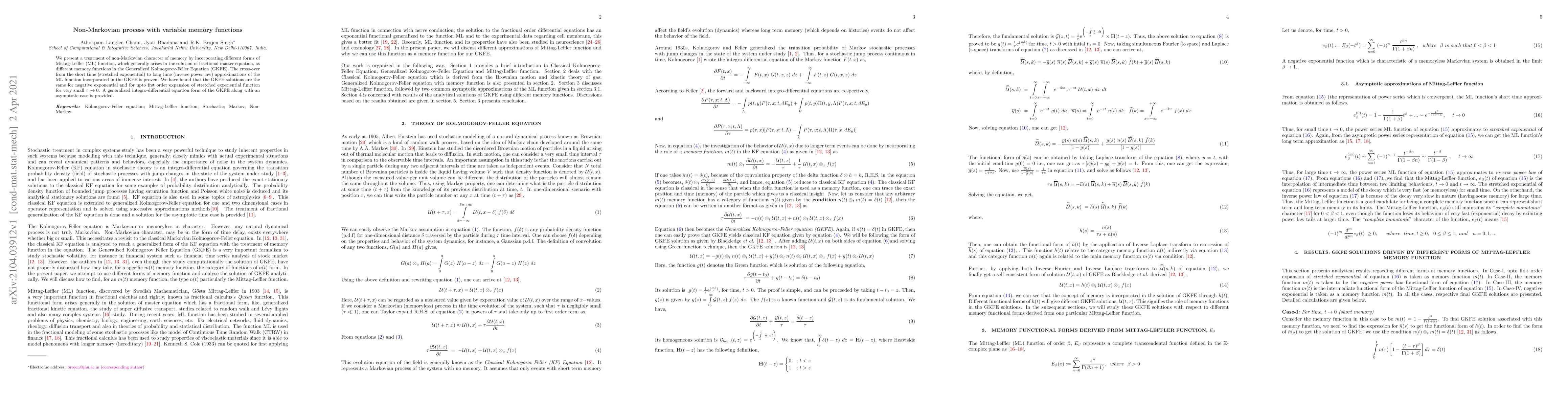 We present a treatment of non-Markovian character of memory by incorporating different forms of Mittag-Leffler (ML) function, which generally arises in the solution of fractional master equation, as different memory functions in the Generalized Kolmogorov-Feller Equation (GKFE). The cross-over from the short time (stretched exponential) to long time (inverse power law) approximations of the ML function incorporated in the GKFE is proven. We have found that the GKFE solutions are the same for negative exponential and for upto frst order expansion of stretched exponential function for very small $\tau \rightarrow 0$. A generalized integro-differential equation form of the GKFE along with an asymptotic case is provided.