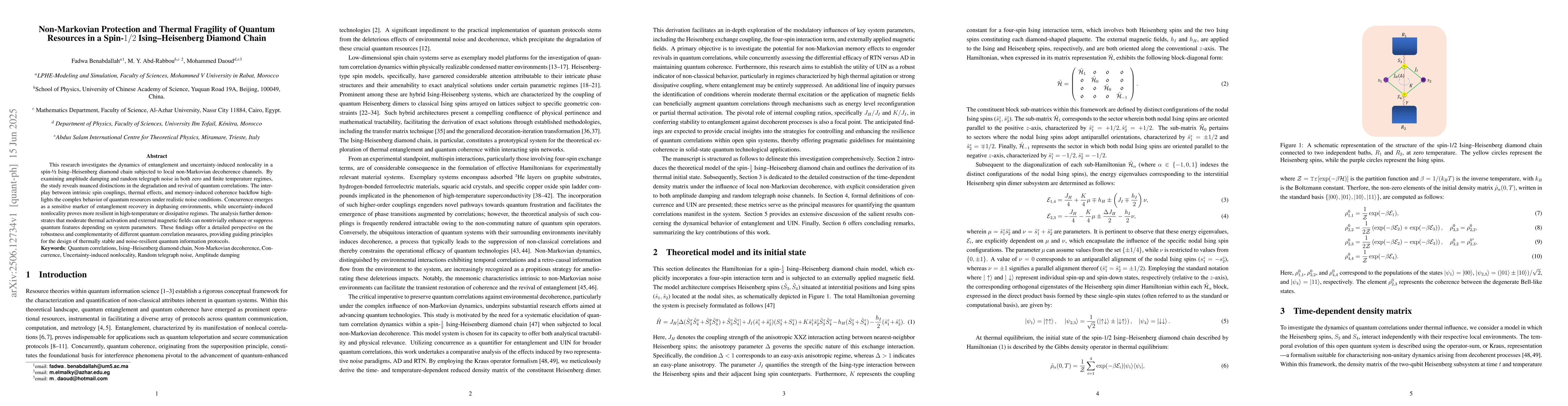 This research investigates the dynamics of entanglement and uncertainty-induced nonlocality in a spin-1/2 Ising-Heisenberg diamond chain subjected to local non-Markovian decoherence channels. By examining amplitude damping and random telegraph noise in both zero and finite temperature regimes, the study reveals nuanced distinctions in the degradation and revival of quantum correlations. The interplay between intrinsic spin couplings, thermal effects, and memory-induced coherence backflow highlights the complex behavior of quantum resources under realistic noise conditions. Concurrence emerges as a sensitive marker of entanglement recovery in dephasing environments, while uncertainty-induced nonlocality proves more resilient in high-temperature or dissipative regimes. The analysis further demonstrates that moderate thermal activation and external magnetic fields can nontrivially enhance or suppress quantum features depending on system parameters. These findings offer a detailed perspective on the robustness and complementarity of different quantum correlation measures, providing guiding principles for the design of thermally stable and noise-resilient quantum information protocols.