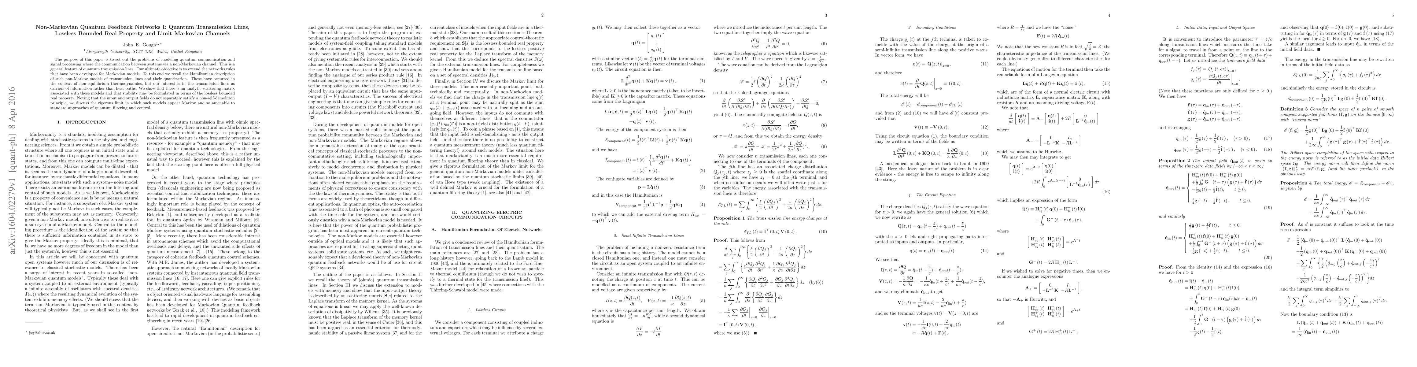 The purpose of this paper is to set out the problems of modeling quantum communication and signal processing where the communication between systems via a non-Markovian channel. This is a general feature of quantum transmission lines. Our ultimate objective is to extend the networks rules that have been developed for Markovian models. To this end we recall the Hamiltonian description of such non-Markov models of transmission lines and their quantization. These have occurred in the context of non-quilibrium thermodynamics, but our interest is in the transmission lines as carriers of information rather than heat baths. We show that there is an analytic scattering matrix associated with these models and that stability may be formulated in terms of the lossless bounded real property. Noting that the input and output fields do not separately satisfy a non-self- demolition principle, we discuss the rigorous limit in which such models appear Markov and so amenable to standard approaches of quantum filtering and control