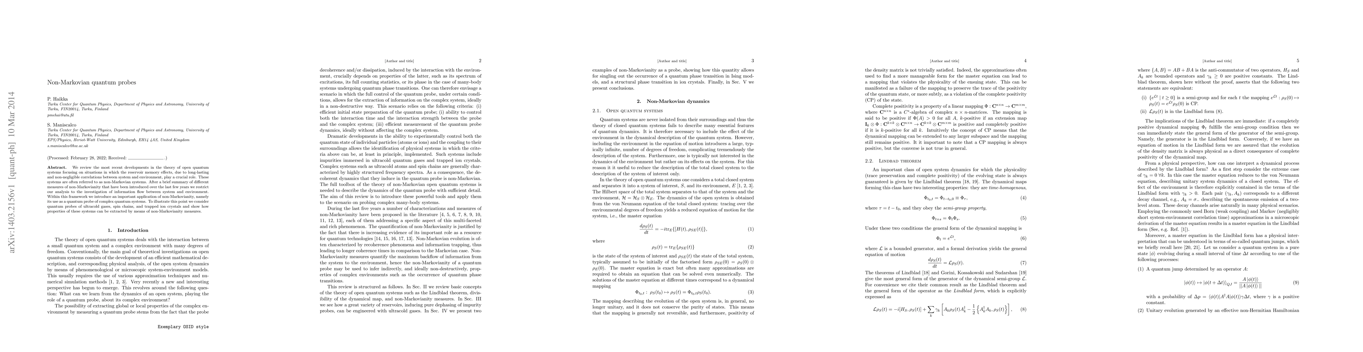 This paper reviews recent advancements in open quantum systems theory, emphasizing non-Markovian systems where memory effects from long-lasting correlations are significant. It explores measures of non-Markovianity and demonstrates their use as quantum probes to extract properties from complex systems like ultracold gases, spin chains, and trapped ion crystals.
