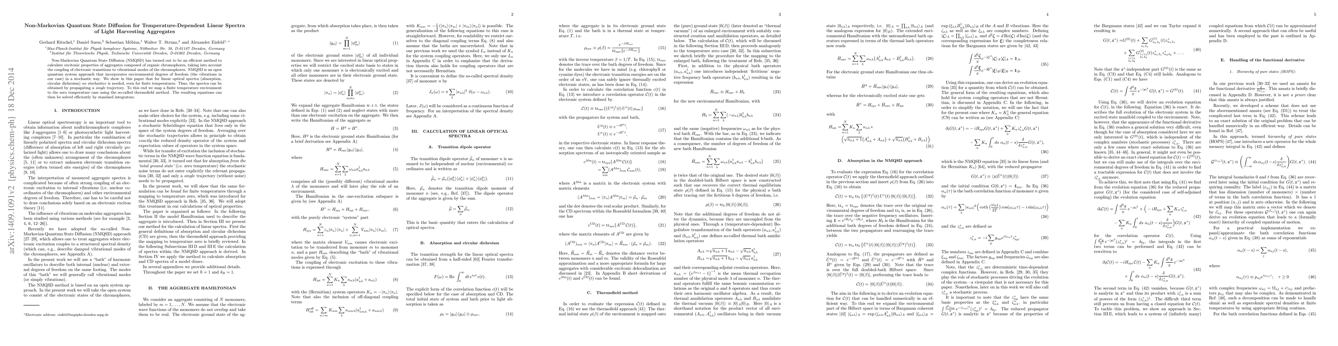 This paper demonstrates that Non-Markovian Quantum State Diffusion (NMQSD) can efficiently calculate excitonic properties of organic chromophore aggregates by considering electronic-vibrational coupling. It reveals that linear optical spectra can be obtained without stochastic processes, even at finite temperatures, by mapping the environment using the thermofield method.