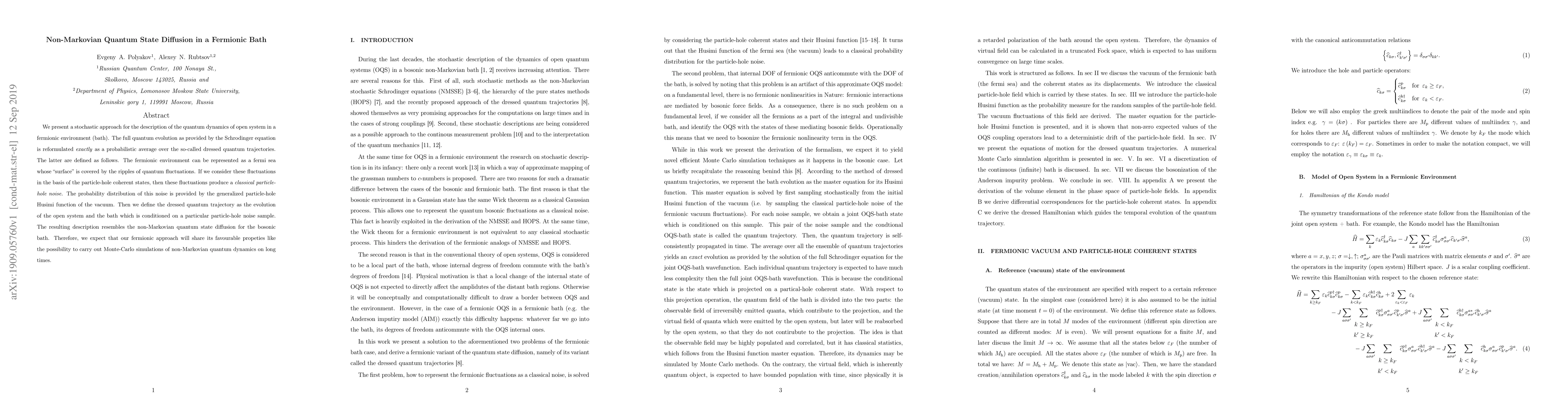 This paper introduces a stochastic method to describe quantum dynamics in open systems immersed in a fermionic bath, reformulating the quantum evolution as a probabilistic average over dressed quantum trajectories conditioned on particle-hole noise. This approach mirrors non-Markovian quantum state diffusion seen in bosonic baths, enabling Monte-Carlo simulations of long-time dynamics.