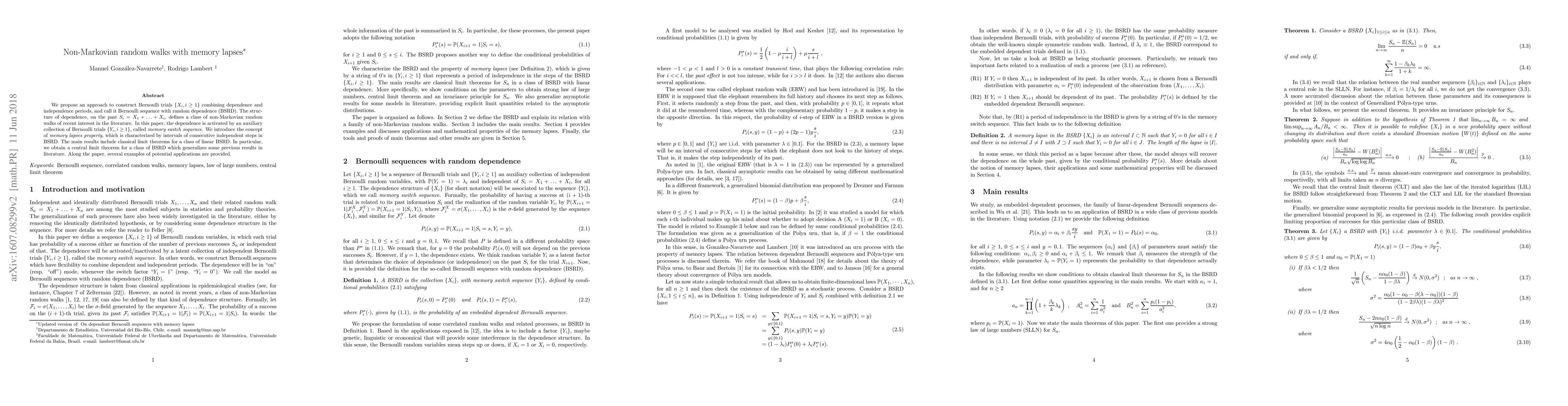 This paper introduces Bernoulli Sequence with Random Dependence (BSRD), a method to create non-Markovian random walks using Bernoulli trials with both dependent and independent periods. The authors define 'memory lapses property' and present classical limit theorems, including a generalized central limit theorem for linear BSRD, with examples of potential applications provided.
