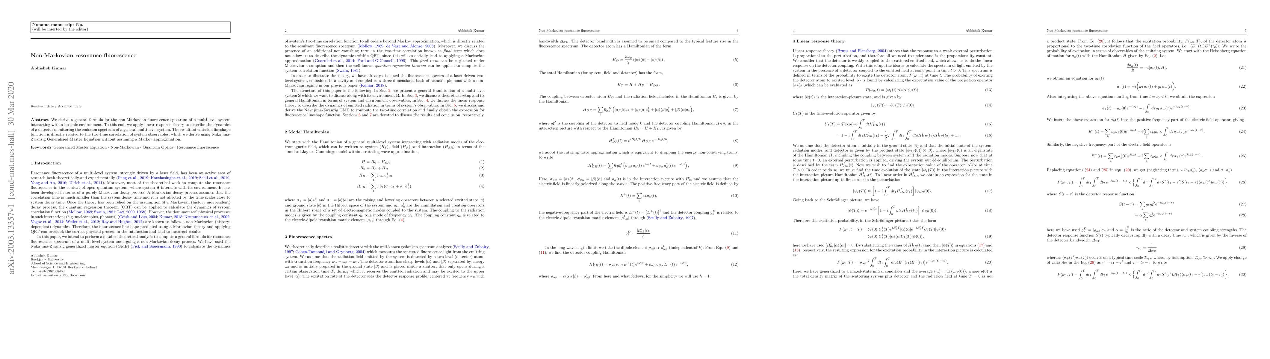 We derive a general formula for the non-Markovian fluorescence spectrum of a multi-level system interacting with a bosonic environment. To this end, we apply linear-response theory to describe the dynamics of a detector monitoring the emission spectrum of a general multi-level system. The resultant emission lineshape function is directly related to the two-time correlation of system observables, which we derive using Nakajima-Zwanzig Generalized Master Equation without assuming a Markov approximation.