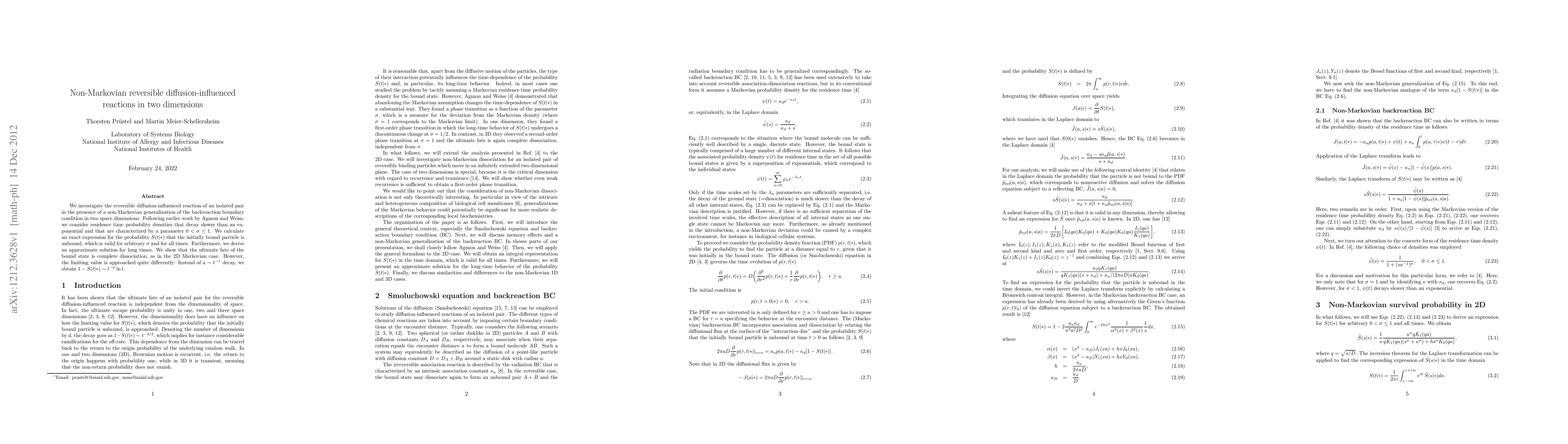 This paper studies reversible diffusion-influenced reactions in two dimensions under non-Markovian conditions, deriving an exact expression for the probability of dissociation over time and showing that the dissociation process follows a $t^{-\sigma}\ln t$ decay rather than the $t^{-1}$ decay observed in the Markovian case.