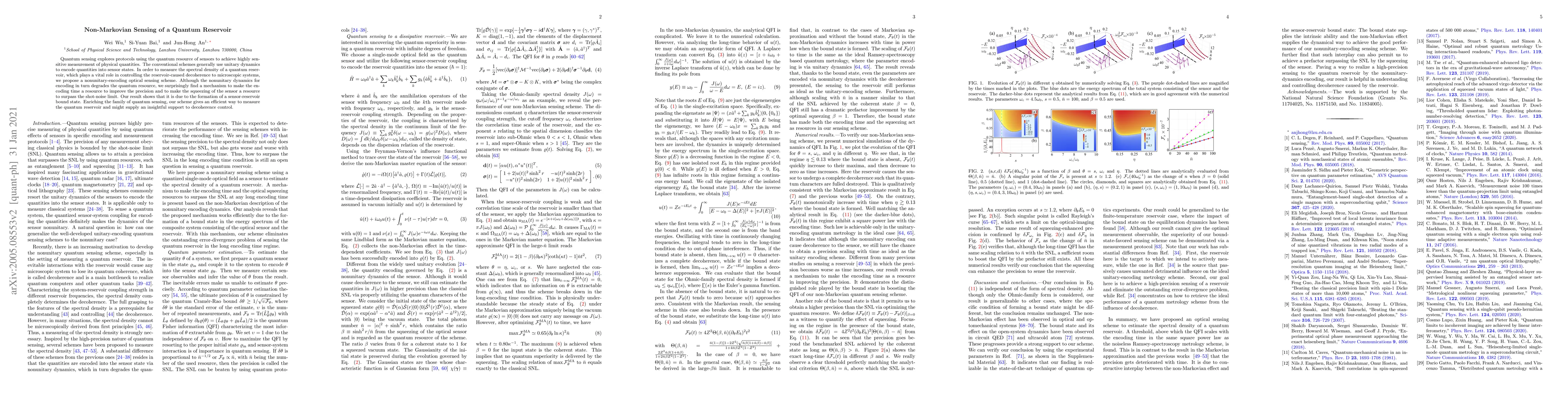 Quantum sensing explores protocols using the quantum resource of sensors to achieve highly sensitive measurement of physical quantities. The conventional schemes generally use unitary dynamics to encode quantities into sensor states. In order to measure the spectral density of a quantum reservoir, which plays a vital role in controlling the reservoir-caused decoherence to microscopic systems, we propose a nonunitary-encoding optical sensing scheme. Although the nonunitary dynamics for encoding in turn degrades the quantum resource, we surprisingly find a mechanism to make the encoding time a resource to improve the precision and to make the squeezing of the sensor a resource to surpass the shot-noise limit. Our result shows that it is due to the formation of a sensor-reservoir bound state. Enriching the family of quantum sensing, our scheme gives an efficient way to measure the quantum reservoir and might supply an insightful support to decoherence control.