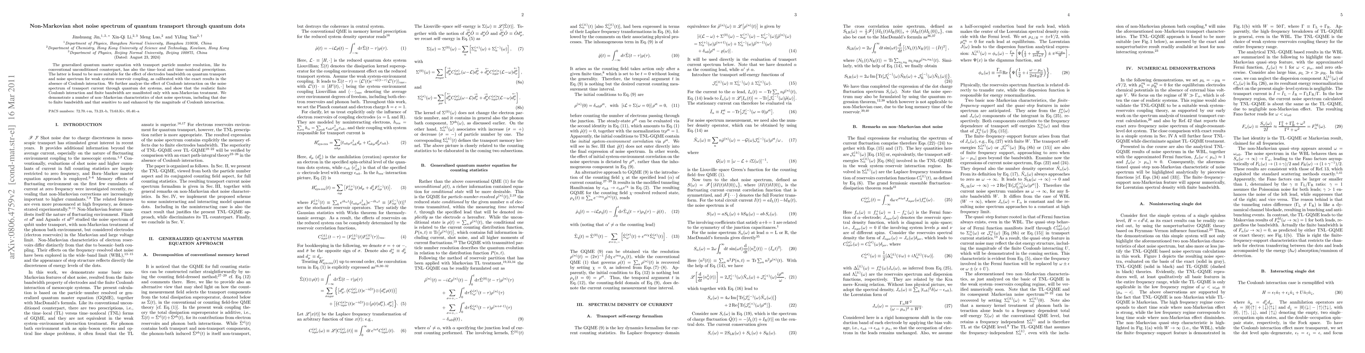 The generalized quantum master equation with transport particle number resolution, like its conventional unconditioned counterpart, has also the time-local and time-nonlocal prescriptions.The latter is found to be more suitable for the effect of electrodes bandwidth on quantum transport and noise spectrum for weak system-reservoir coupling, as calibrated with the exact results in the absence of Coulomb interaction. We further analyze the effect of Coulomb interaction on the noise spectrum of transport current through quantum dot systems, and show that the realistic finite Coulomb interaction and finite bandwidth are manifested only with non-Markovian treatment. We demonstrate a number of non-Markovian characteristics of shot noise spectrum, including that due to finite bandwidth and that sensitive to and enhanced by the magnitude of Coulomb interaction.