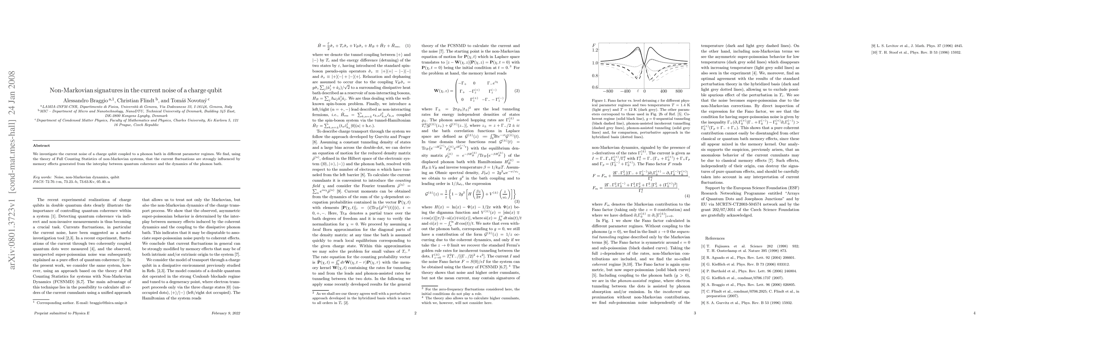 Summary: The current noise in a charge qubit linked to a phonon bath exhibits non-Markovian signatures due to memory effects from quantum coherence and phonon dynamics, as revealed by Full Counting Statistics theory. This reveals significant non-Markovian influences on current fluctuations.