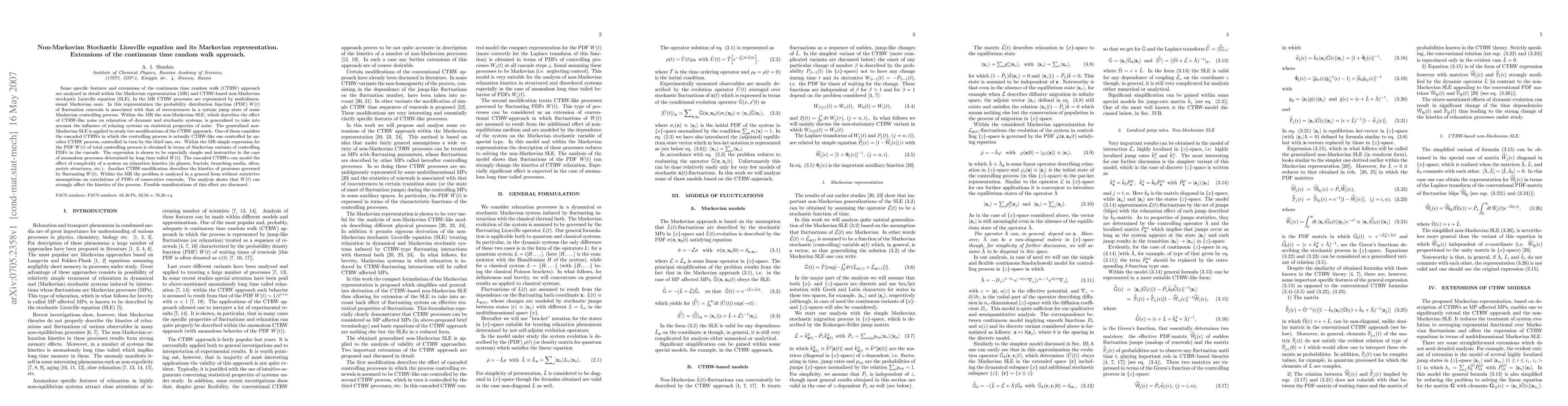 Some specific features and extensions of the continuous time random walk (CTRW) approach are analyzed in detail within the Markovian representation (MR) and CTRW-based non-Markovian stochastic Liouville equation (SLE). In the MR CTRW processes are represented by multidimensional Markovian ones. In this representation the probability distribution function (PDF) W(t) of fluctuation renewals is associated with that of reoccurrences in a certain jump state of some Markovian controlling process. Within the MR the non-Markovian SLE, which describes the effect of CTRW-like noise on relaxation of dynamic and stochastic systems, is generalized to take into account the influence of relaxing systems on statistical properties of noise. The generalized non-Markovian SLE is applied to study two modifications of the CTRW approach. One of them considers the cascaded CTRWs in which the controlling process is actually CTRW-like one controlled by another CTRW process, controlled in turn by the third one, etc. Within the MR simple expression for the PDF W(t) of total controlling process is obtained in terms of Markovian variants of controlling PDFs in the cascade. The expression is shown to be especially simple and instructive in the case of anomalous processes determined by long time tailed W(t). The cascaded CTRWs can model the effect of complexity of a system on relaxation kinetics (in glasses, fractals, branching media, ultrametric structures, etc.). Another CTRW-modification describes the kinetics of processes governed by fluctuating W(t). Within the MR the problem is analyzed in a general form without restrictive assumptions on correlations of PDFs of consecutive renewals. The analysis shows that W(t) can strongly affect the kinetics of the process. Possible manifestations of this effect are discussed.