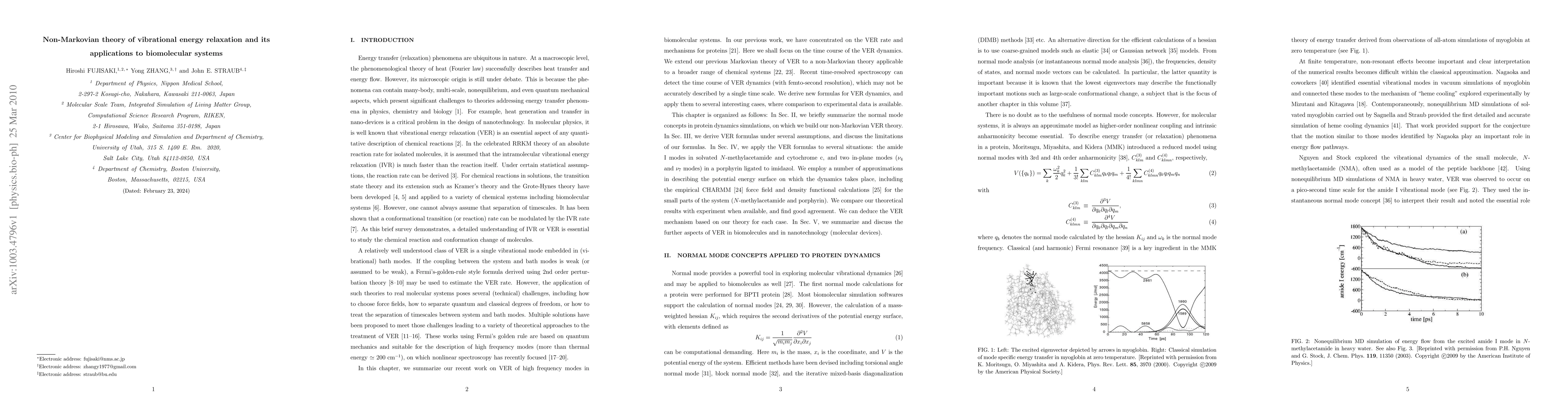 Energy transfer (relaxation) phenomena are ubiquitous in nature. At a macroscopic level, the phenomenological theory of heat (Fourier law) successfully describes heat transfer and energy flow. However, its microscopic origin is still under debate. This is because the phenomena can contain many-body, multi-scale, nonequilibrium, and even quantum mechanical aspects, which present significant challenges to theories addressing energy transfer phenomena in physics, chemistry and biology. In this paper, we describe our recent theoretical attempts to treat vibrational energy relaxation (VER) in biomolecular systems, including peptide, porphyrin, and protein. First we construct a reduced model using (instantaneous) normal mode analysis, and further add anharmonic coupling between vibrational modes. Using such a model combined with time-dependent perturbation theory for the anharmonic coupling, we derive non-Markovian VER formulas, which are applicable to small timescales such as sub picoseconds. We apply the VER formulas with full atomistic detail to various biomolecular systems, discuss the VER timescales and mechanisms, and compare with experiment if possible. We finally mention further theoretical prospects of the energy transfer phenomena in physics, chemistry, and biology.