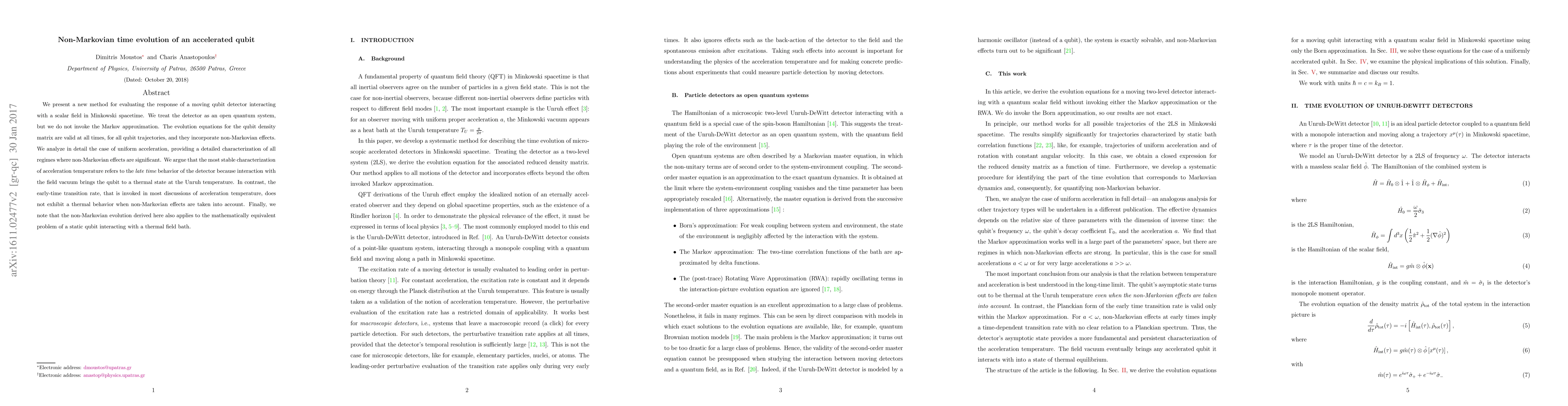 We present a new method for evaluating the response of a moving qubit detector interacting with a scalar field in Minkowski spacetime. We treat the detector as an open quantum system, but we do not invoke the Markov approximation. The evolution equations for the qubit density matrix are valid at all times, for all qubit trajectories and they incorporate non-Markovian effects. We analyze in detail the case of uniform acceleration, providing a detailed characterization of all regimes where non-Markovian effects are significant. We argue that the most stable characterization of acceleration temperature refers to the late time behavior of the detector, because interaction with the field vacuum brings the qubit to a thermal state at the Unruh temperature. In contrast, the early-time transition rate, that is invoked in most discussions of acceleration temperature, does not exhibit a thermal behavior when non-Markovian effects are taken into account. Finally, we note that the non-Markovian evolution derived here also applies to the mathematically equivalent problem of a static qubit interacting with a thermal field bath.