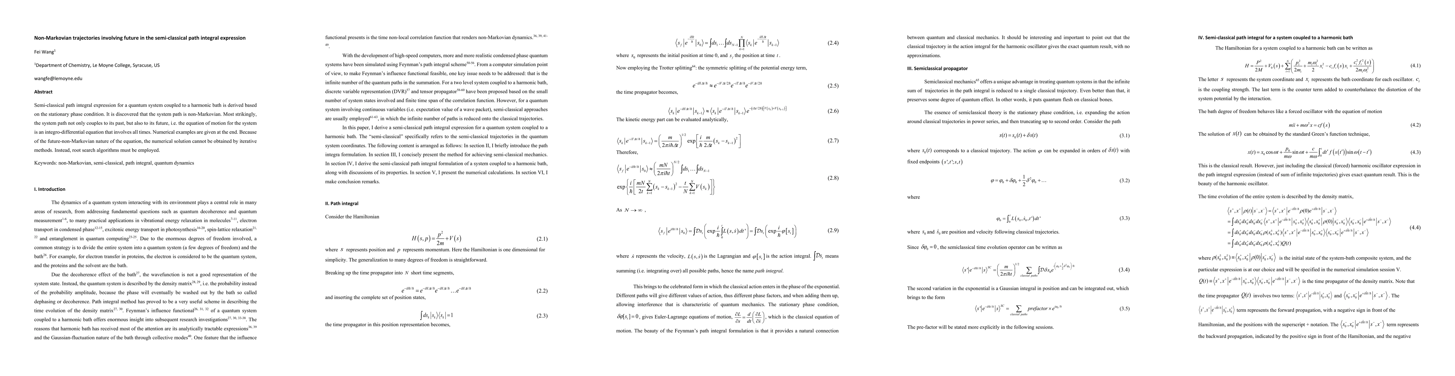 Semiclassical path integral expression for a quantum system coupled to a harmonic bath is derived based on the stationary phase condition. It is discovered that the system path is non-Markovian. Most strikingly, the system path not only couples to its past (as in the Langevin equation), but also to its future, i.e. the equation of motion for the system is an integro-differential equation that involves all times. Numerical tests are performed to confirm that the future-involved term is indeed necessary. Because of the future-non-Markovian nature of the equation, the numerical solution cannot be obtained by iterative methods. Instead, root search algorithms must be employed.