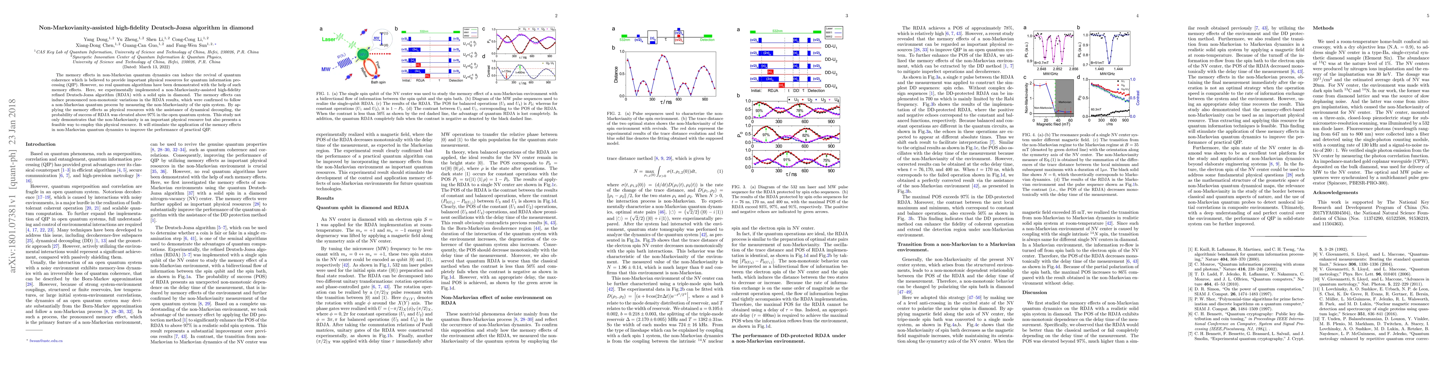The memory effects in non-Markovian quantum dynamics can induce the revival of quantum coherence, which is believed to provide important physical resources for quantum information processing (QIP). However, no real quantum algorithms have been demonstrated with the help of such memory effects. Here, we experimentally implemented a non-Markovianity-assisted highfidelity refined Deutsch-Jozsa algorithm (RDJA) with a solid spin in diamond. The memory effects can induce pronounced nonmonotonic variations in the RDJA results, which were confirmed to follow a non-Markovian quantum process by measuring the non-Markovianity of the spin system. By applying the memory effects as physical resources with the assistance of dynamical decoupling, the probability of success of RDJA was elevated above 97% in the open quantum system. This study not only demonstrates that the non-Markovianity is an important physical resource but also presents a feasible way to employ this physical resource. It will stimulate the application of the memory effects in non-Markovian quantum dynamics to improve the performance of practical QIP.