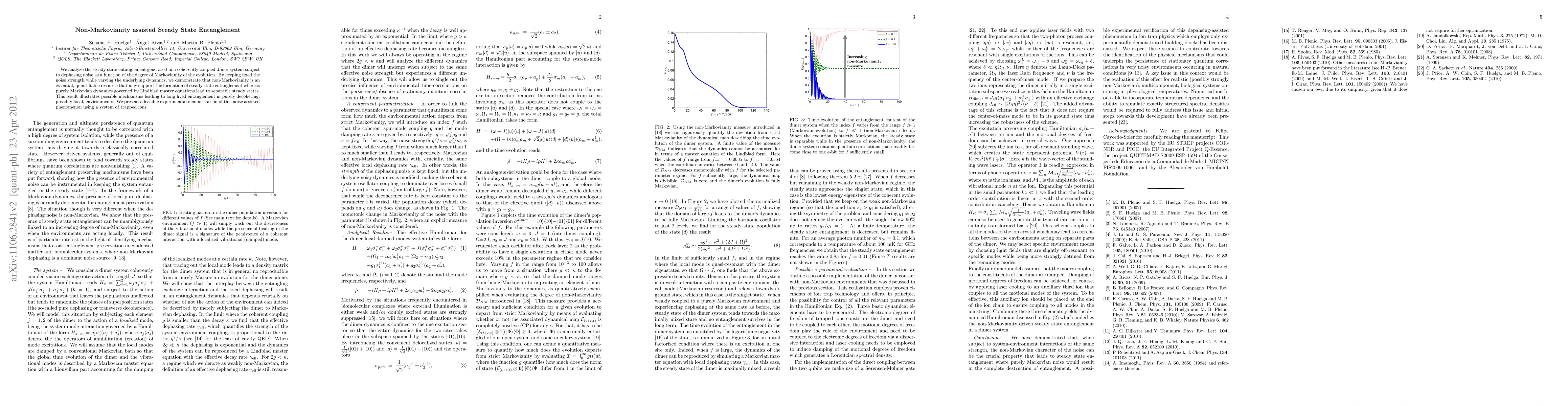 This paper explores how non-Markovianity enhances steady state entanglement in a dimer system under dephasing noise, showing that it can lead to entangled states while Markovian dynamics result in separable states. The study proposes a practical experiment using trapped ions to demonstrate this phenomenon.