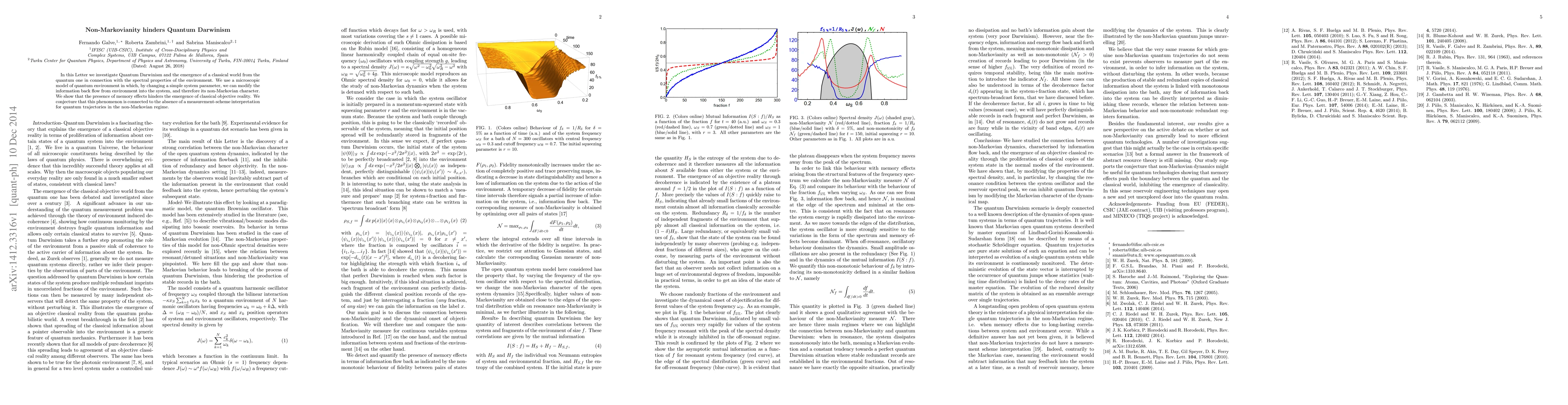 In this Letter we investigate Quantum Darwinism and the emergence of a classical world from the quantum one in connection with the spectral properties of the environment. We use a microscopic model of quantum environment in which, by changing a simple system parameter, we can modify the information back flow from environment into the system, and therefore its non-Markovian character. We show that the presence of memory effects hinders the emergence of classical objective reality. We conjecture that this phenomenon is connected to the absence of a measurement-scheme interpretation for quantum trajectories in the non-Markovian regime.