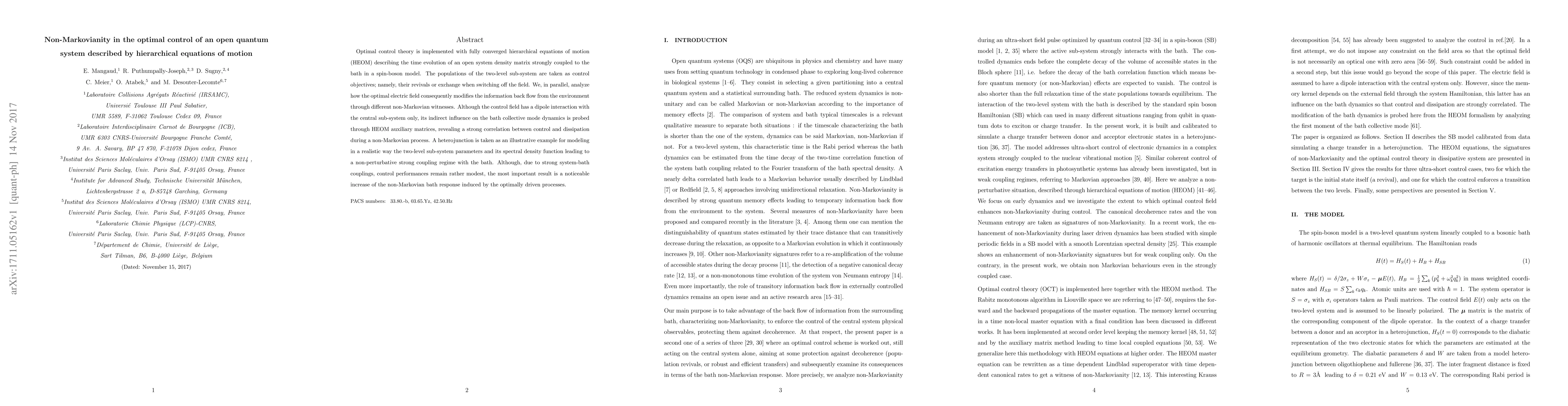 Optimal control theory is implemented with fully converged hierarchical equations of motion (HEOM) describing the time evolution of an open system density matrix strongly coupled to the bath in a spin-boson model. The populations of the two-level sub-system are taken as control objectives; namely, their revivals or exchange when switching off the field. We, in parallel, analyze how the optimal electric field consequently modifies the information back flow from the environment through different non-Markovian witnesses. Although the control field has a dipole interaction with the central sub-system only, its indirect influence on the bath collective mode dynamics is probed through HEOM auxiliary matrices, revealing a strong correlation between control and dissipation during a non-Markovian process. A heterojunction is taken as an illustrative example for modeling in a realistic way the two-level sub-system parameters and its spectral density function leading to a non-perturbative strong coupling regime with the bath. Although, due to strong system-bath couplings, control performances remain rather modest, the most important result is a noticeable increase of the non-Markovian bath response induced by the optimally driven processes.