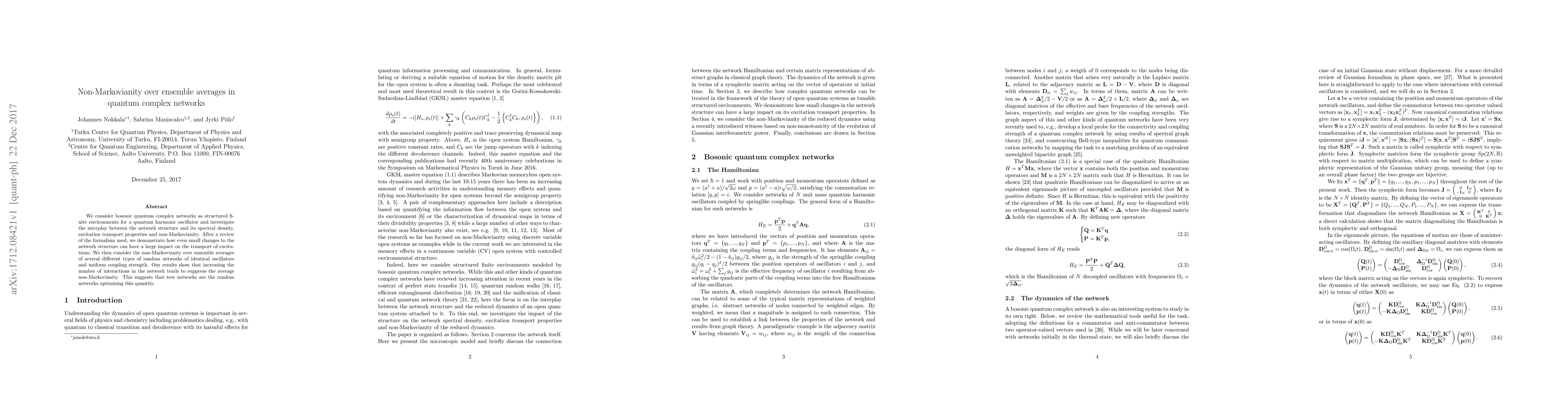 We consider bosonic quantum complex networks as structured finite environments for a quantum harmonic oscillator and investigate the interplay between the network structure and its spectral density, excitation transport properties and non-Markovianity. After a review of the formalism used, we demonstrate how even small changes to the network structure can have a large impact on the transport of excitations. We then consider the non-Markovianity over ensemble averages of several different types of random networks of identical oscillators and uniform coupling strength. Our results show that increasing the number of interactions in the network tends to suppress the average non-Markovianity. This suggests that tree networks are the random networks optimizing this quantity.