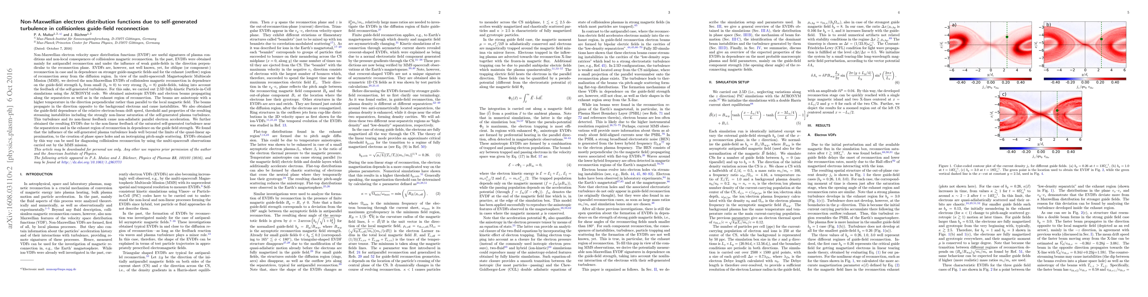 This paper investigates non-Maxwellian electron velocity distribution functions (EVDFs) in collisionless magnetic reconnection under varying guide-field strengths, using 2.5D Particle-in-Cell simulations. It reveals anisotropic EVDFs and electron beams, with higher perpendicular temperatures, and identifies the influence of self-generated turbulence on electron acceleration and instabilities.