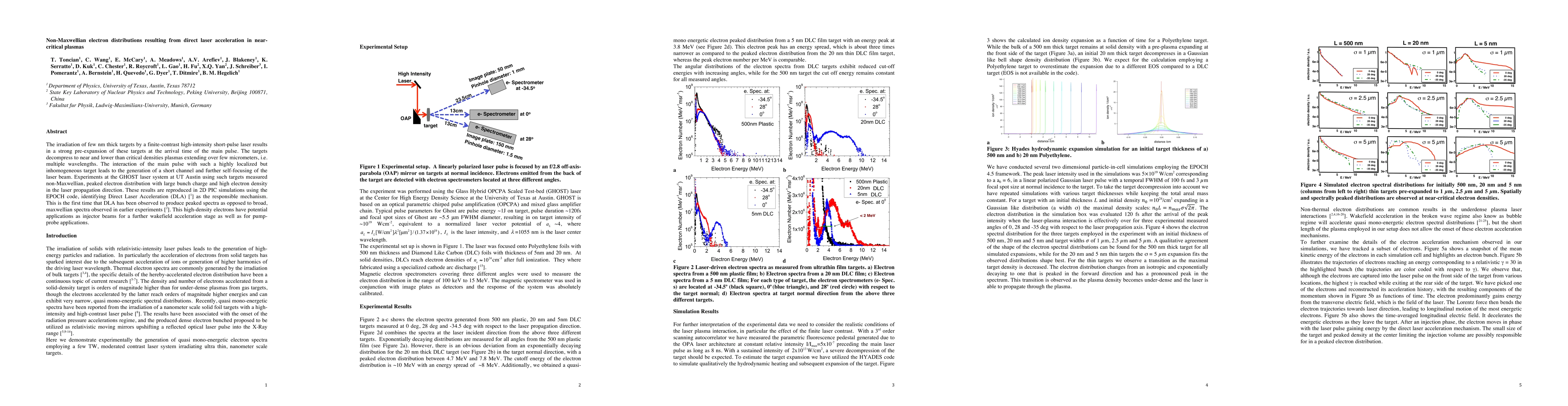 This paper reports on the generation of non-Maxwellian, peaked electron distributions via Direct Laser Acceleration in near-critical plasmas, observed in experiments and simulations. The findings suggest potential applications for these high-density electron beams in wakefield acceleration and pump-probe experiments.