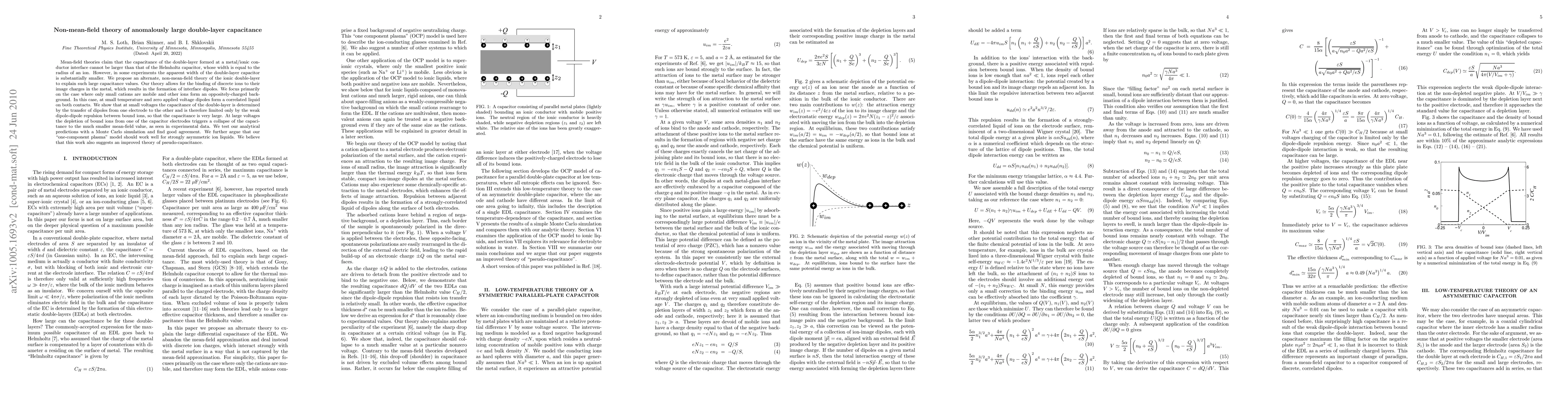 This paper proposes a non-mean-field theory to explain anomalously large double-layer capacitances, attributing it to the formation of interface dipoles from the binding of discrete ions to their image charges in the metal. The model predicts large capacitance due to dipole-dipole repulsion at small voltages, collapsing to mean-field values at larger voltages, and is validated by Monte Carlo simulations.