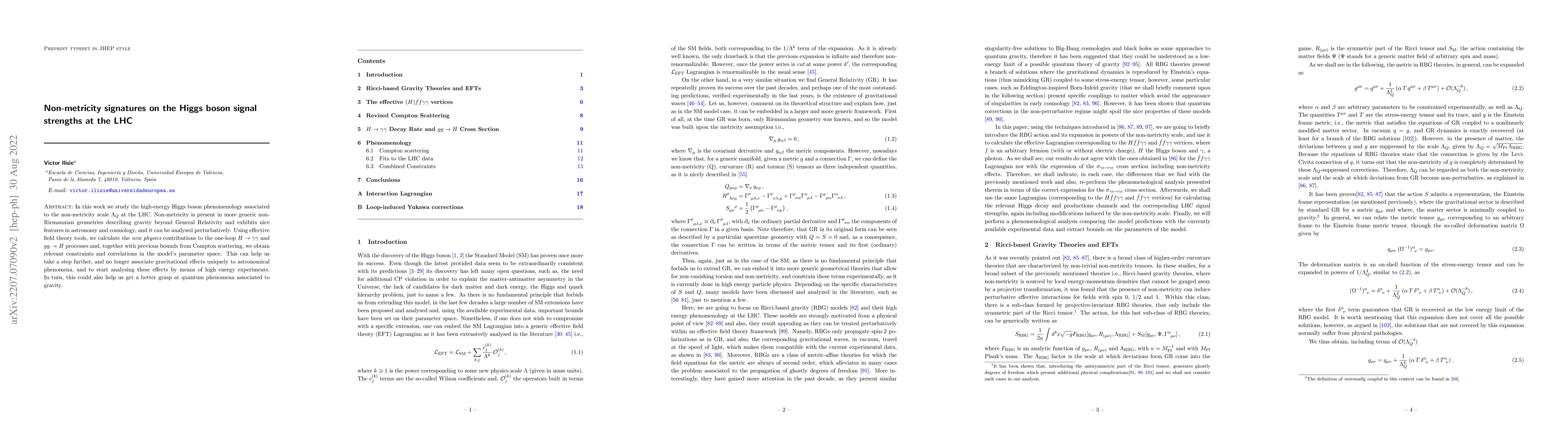 This paper investigates how non-metricity, a feature of non-Riemannian geometries beyond General Relativity, influences Higgs boson signal strengths at the LHC. It calculates contributions from non-metricity to one-loop processes and derives constraints on the model's parameters, suggesting a new approach to studying gravitational effects through high-energy experiments.