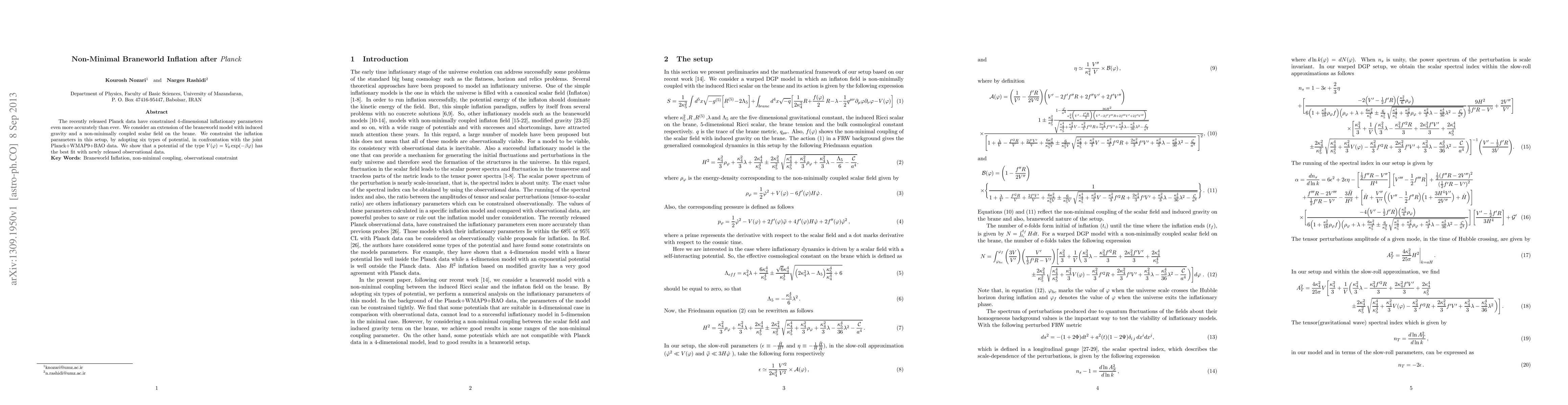 This paper explores an extended braneworld model with non-minimally coupled scalar field inflation, constrained by recent Planck data. It finds that a potential of the form $V(\varphi)=V_{0}\exp(-\beta\varphi)$ provides the best fit to observational data from Planck, WMAP9, and BAO.