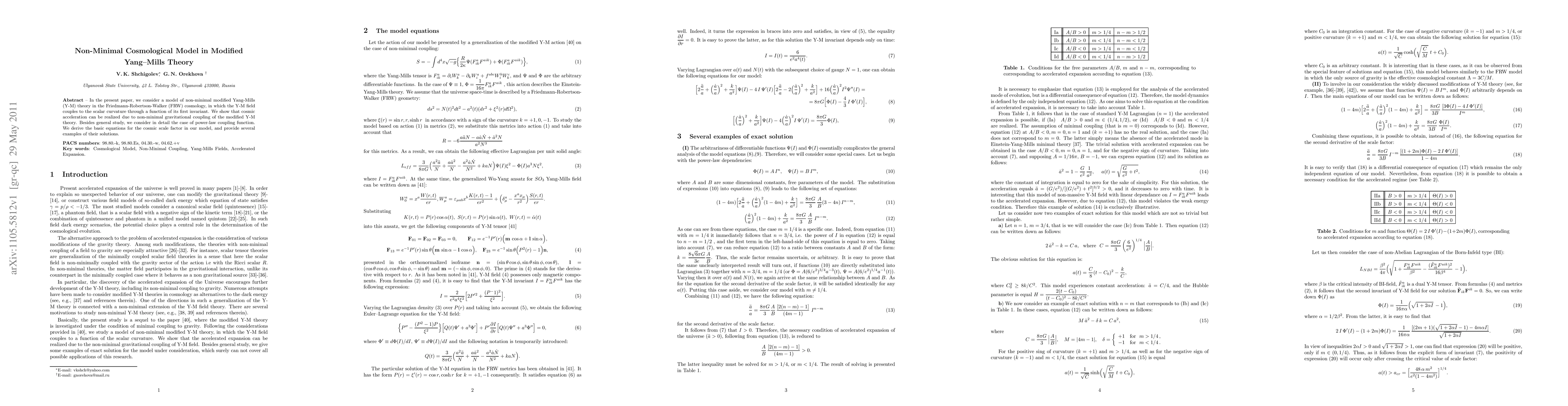 This paper explores a non-minimal modified Yang-Mills theory in Friedmann-Robertson-Walker cosmology, demonstrating cosmic acceleration through non-minimal gravitational coupling. It focuses on a power-law coupling function, deriving equations for the cosmic scale factor and presenting solution examples.