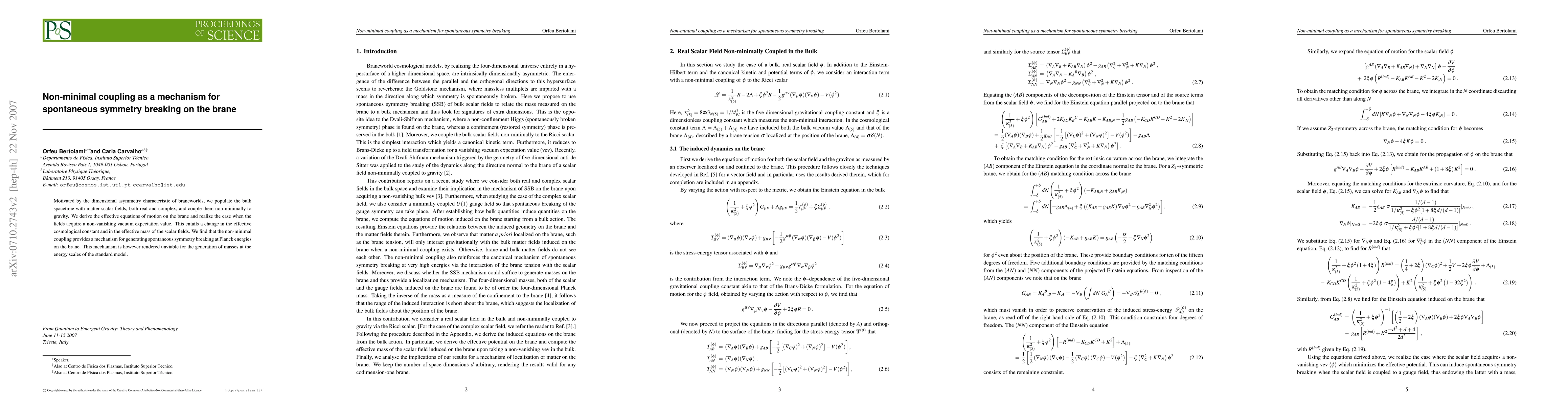 The paper derives effective equations of motion on the brane for matter scalar fields non-minimally coupled to gravity, demonstrating a mechanism for spontaneous symmetry breaking at high energies.