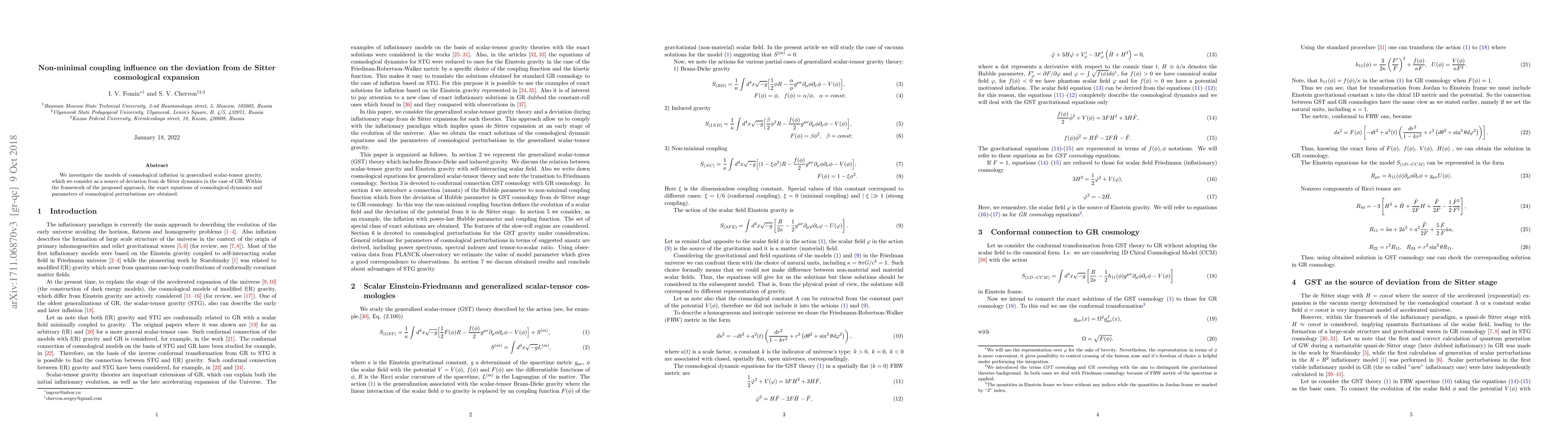 We investigate the models of cosmological inflation in generalized scalar-tensor gravity, which we consider as a source of deviation from de Sitter dynamics in the case of GR. Within the framework of the proposed approach, the exact equations of cosmological dynamics and parameters of cosmological perturbations are obtained.