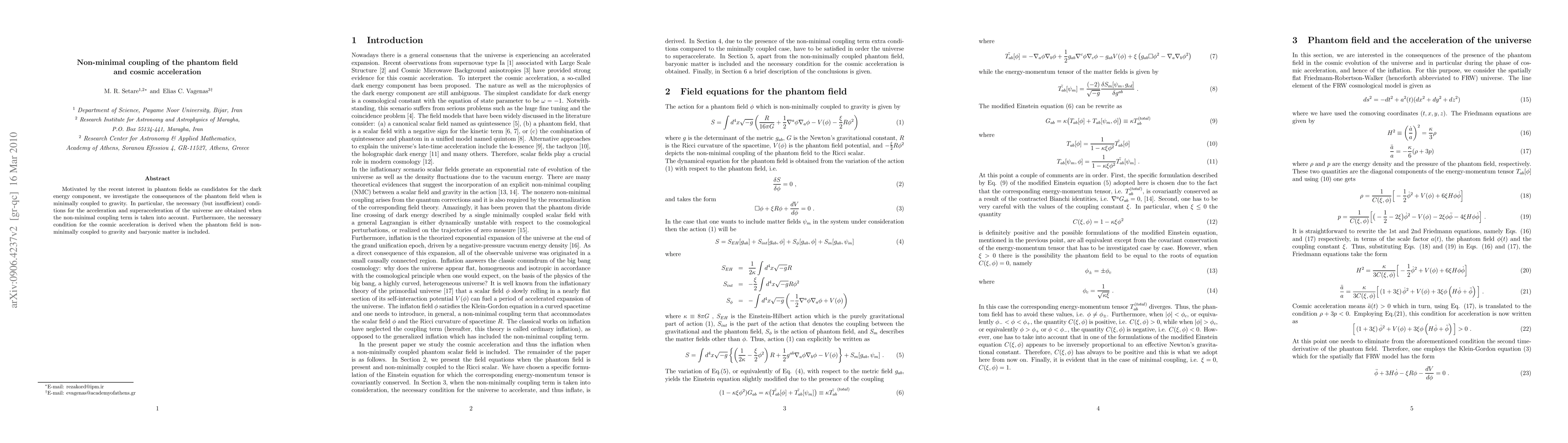 Motivated by the recent interest in phantom fields as candidates for the dark energy component, we investigate the consequences of the phantom field when is minimally coupled to gravity. In particular, the necessary (but insufficient) conditions for the acceleration and superacceleration of the universe are obtained when the non-minimal coupling term is taken into account. Furthermore, the necessary condition for the cosmic acceleration is derived when the phantom field is non-minimally coupled to gravity and baryonic matter is included.