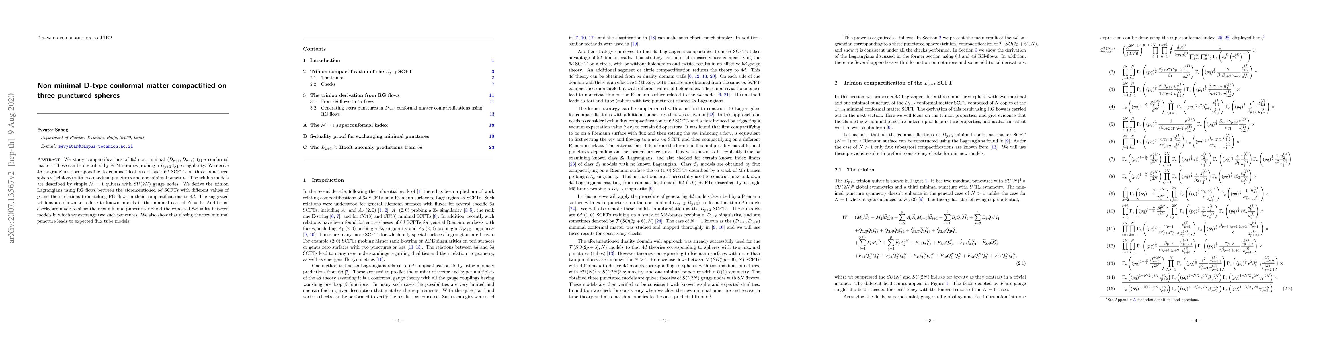 This paper explores the compactification of $6d$ non-minimal $(D_{p+3},D_{p+3})$ conformal field theories on three punctured spheres (trinions), deriving $4d$ Lagrangians from these compactifications and demonstrating their reduction to known minimal models, while also confirming S-duality and flux tube behavior.