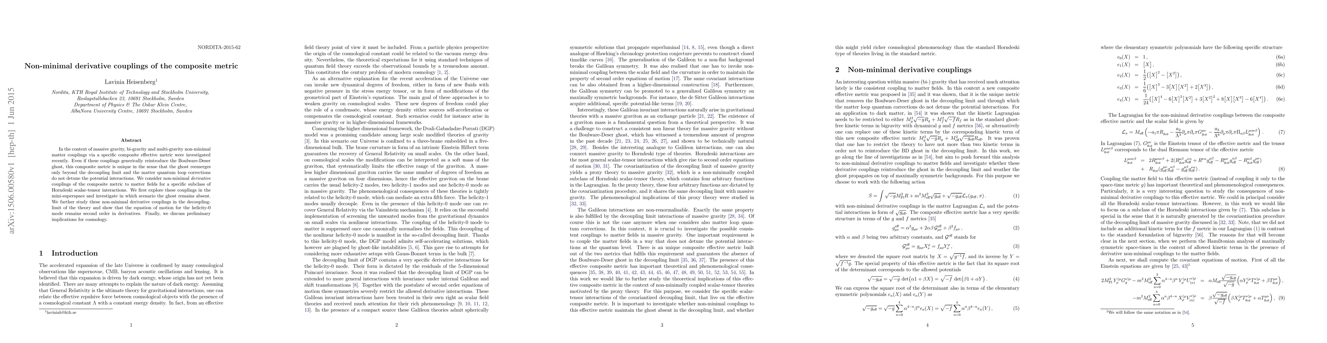 This paper explores non-minimal derivative couplings of a composite metric in massive gravity and scalar-tensor theories, demonstrating that the associated ghost issue only arises beyond the decoupling limit. It shows that these couplings maintain second-order equations of motion for the helicity-0 mode, with preliminary implications for cosmological models.