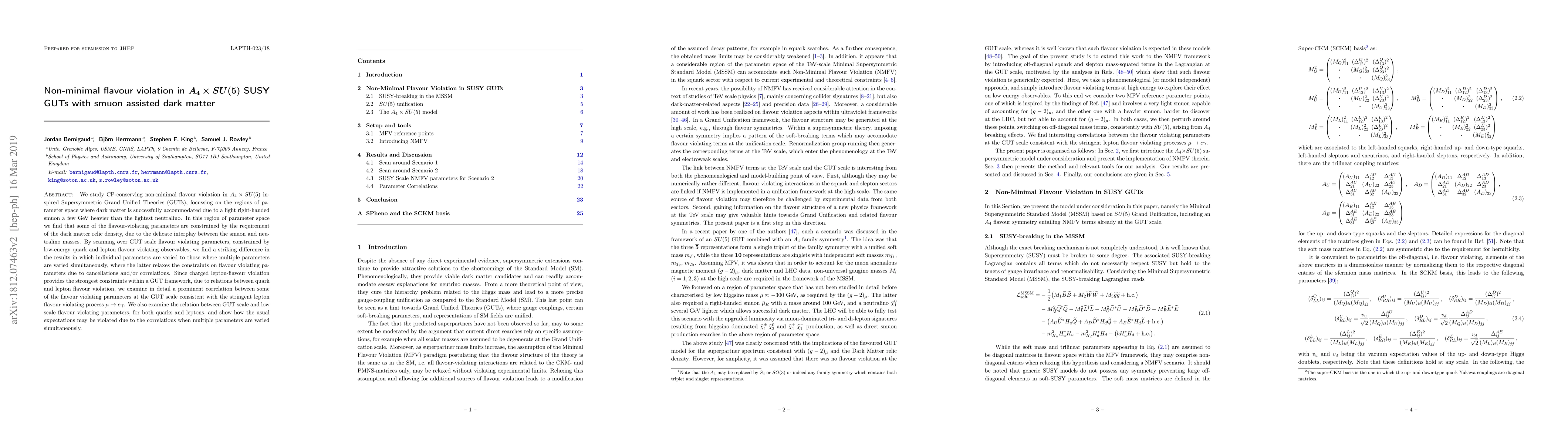 This paper explores CP-conserving non-minimal flavour violation in $A_4 \times SU(5)$ inspired SUSY GUTs, focusing on dark matter scenarios where a light right-handed smuon plays a key role. The study finds that dark matter relic density constraints can relax flavour violation parameter bounds due to cancellations and correlations when multiple parameters are varied simultaneously, in contrast to individual parameter variations.