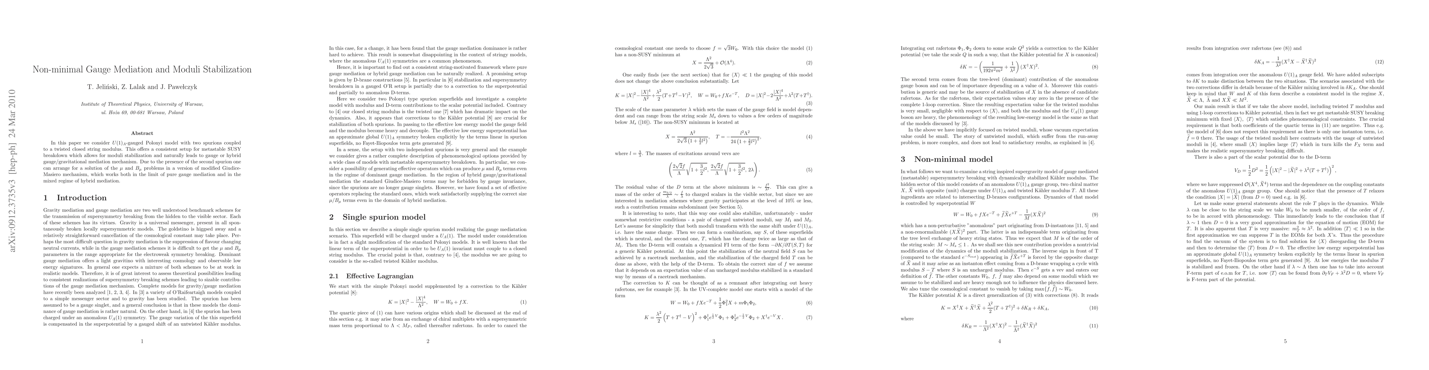 In this paper we consider U(1)-gauged Polony'i model with two spurions coupled to a twisted closed string modulus. This offers a consistent setup for metastable SUSY breakdown which allows for moduli stabilization and naturally leads to gauge or hybrid gauge/gravitational mediation mechanism. Due to the presence of the second spurion one can arrange for a solution of the \mu and B_\mu problems in a version of modified Giudice-Masiero mechanism, which works both in the limit of pure gauge mediation and in the mixed regime of hybrid mediation.