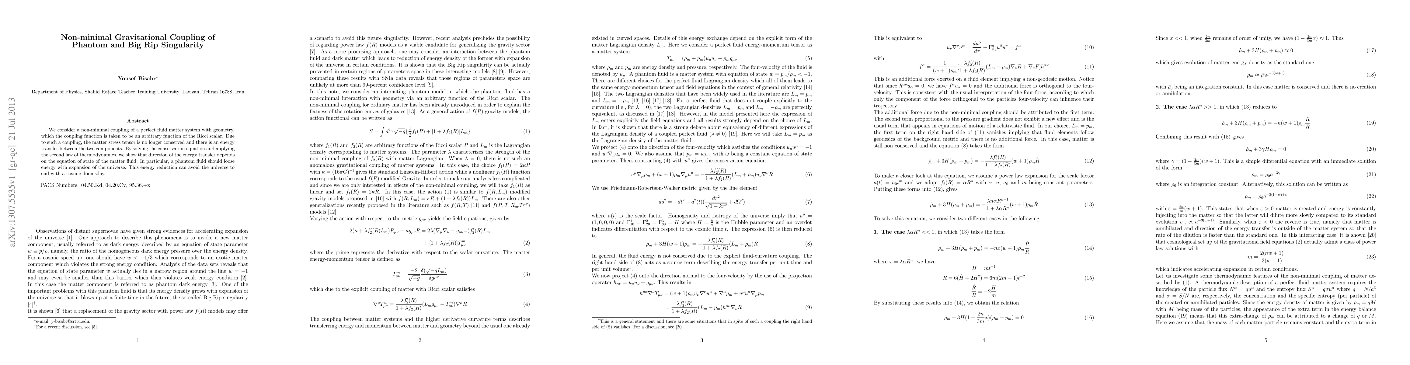 We consider a non-minimal coupling of a perfect fluid matter system with geometry, which the coupling function is taken to be an arbitrary function of the Ricci scalar. Due to such a coupling, the matter stress tensor is no longer conserved and there is an energy transfer between the two components. By solving the conservation equation and applying the second law of thermodynamics, we show that direction of the energy transfer depends on the equation of state of the matter fluid. In particular, a phantom fluid should loose energy with expansion of the universe. This energy reduction can avoid the universe to end with a cosmic doomsday.
