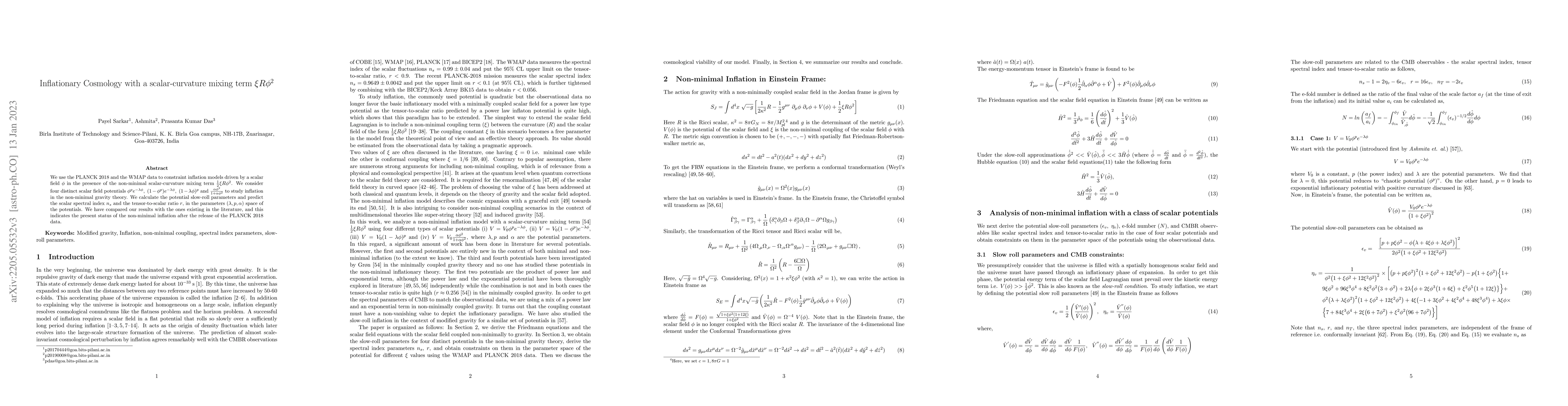 This paper investigates inflation models driven by a scalar field with a non-minimal scalar-curvature mixing term, using PLANCK 2018 and WMAP data. It explores four scalar field potentials to calculate slow-roll parameters and predict the scalar spectral index $n_s$ and tensor-to-scalar ratio $r$.