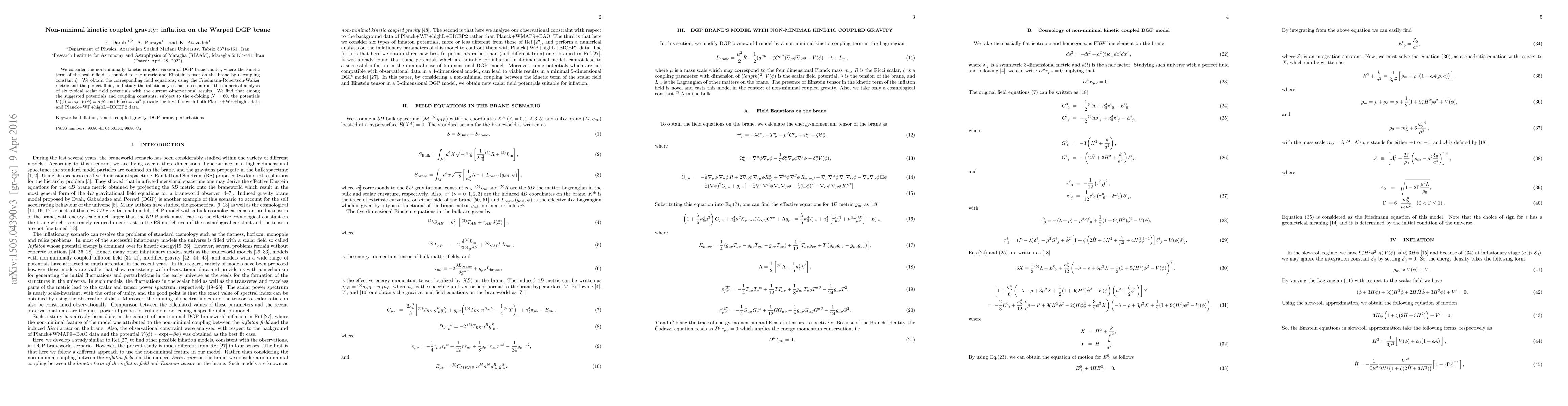 We consider the non-minimally kinetic coupled version of DGP brane model, where the kinetic term of the scalar field is coupled to the metric and Einstein tensor on the brane by a coupling constant $\zeta$. We obtain the corresponding field equations, using the Friedmann-Robertson-Walker metric and the perfect fluid, and study the inflationary scenario to confront the numerical analysis of six typical scalar field potentials with the current observational results. We find that among the suggested potentials and coupling constants, subject to the e-folding $N=60$, the potentials $V(\phi)=\sigma\phi$, $V(\phi)=\sigma\phi^2$ and $V(\phi)=\sigma\phi^3$ provide the best fits with both Planck+WP+highL data and Planck+WP+highL+BICEP2 data.