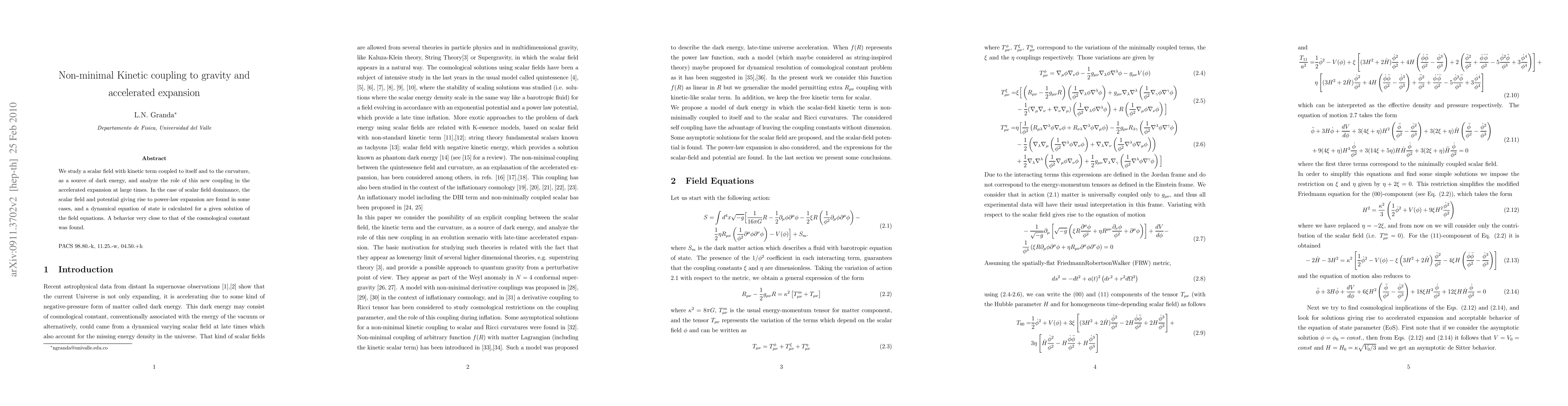 We study a scalar field with kinetic term coupled to itself and to the curvature, as a source of dark energy, and analyze the role of this new coupling in the accelerated expansion at large times. In the case of scalar field dominance, the scalar field and potential giving rise to power-law expansion are found in some cases, and a dynamical equation of state is calculated for a given solution of the field equations. A behavior very close to that of the cosmological constant was found.