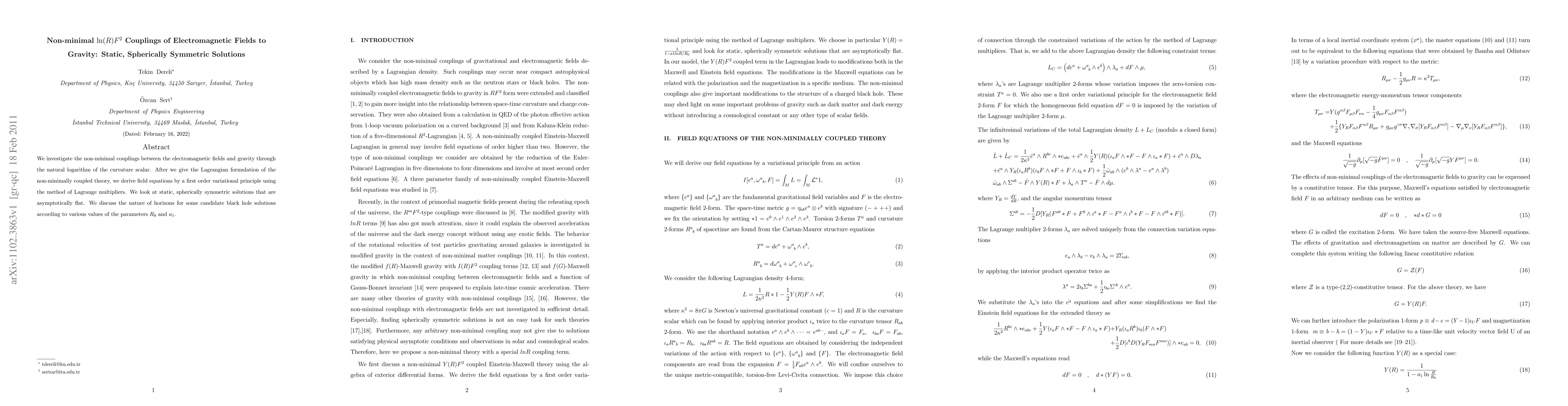 We investigate the non-minimal couplings between the electromagnetic fields and gravity through the natural logarithm of the curvature scalar. After we give the Lagrangian formulation of the non-minimally coupled theory, we derive field equations by a first order variational principle using the method of Lagrange multipliers. We look at static, spherically symmetric solutions that are asymptotically flat. We discuss the nature of horizons for some candidate black hole solutions according to various values of the parameters $R_0 $ and $a_1$.
